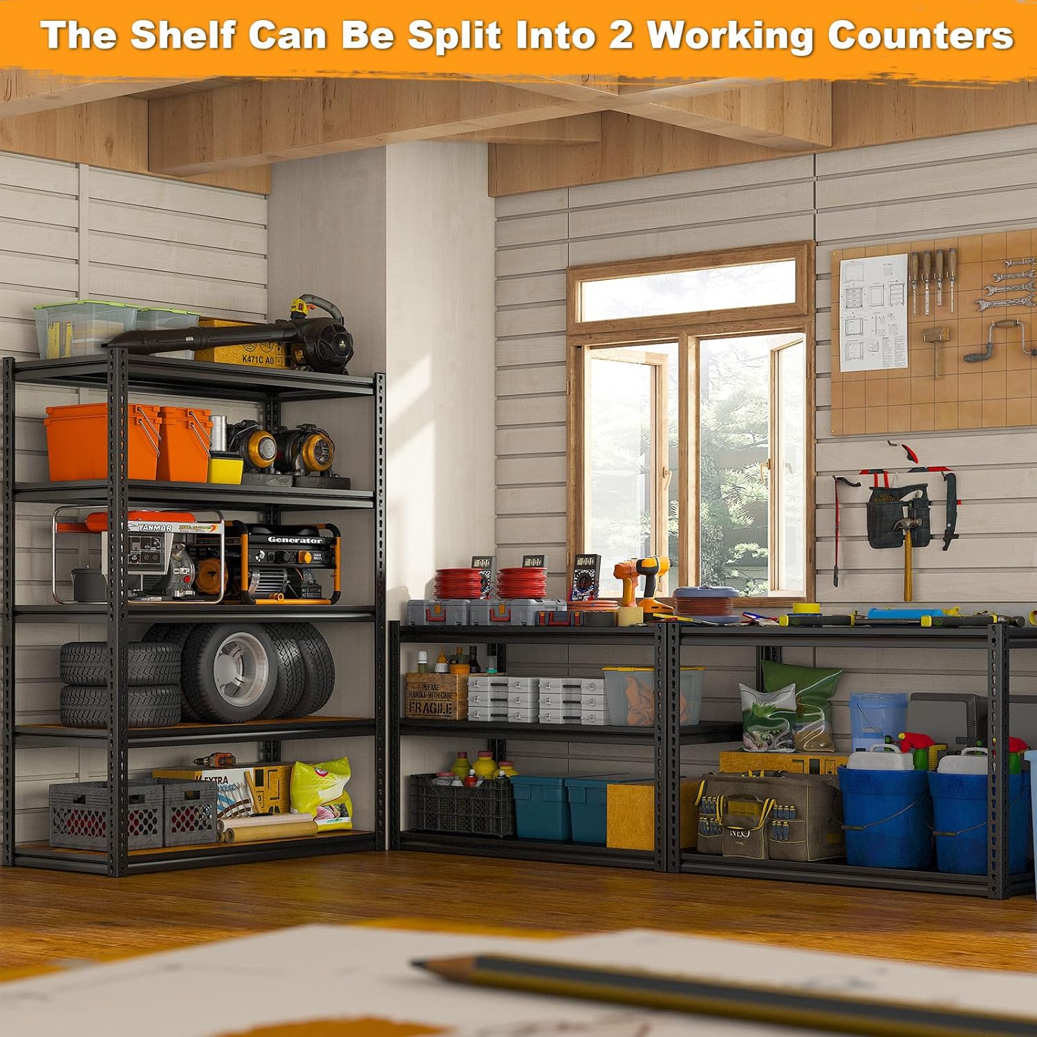 - 【Adjustable Garage Storage Shelving Unit to Meet Different Needs】With the post connector, it can be easily turned into two shorter units that serve as a table, workbench, or corner shelf for using storage space efficient. Metal shelving for garage is designed with adjustable connectors. Each tier can be adjusted up and down by 1.4", so you can easily adjust up or down to accommodate your need and store items of different sizes