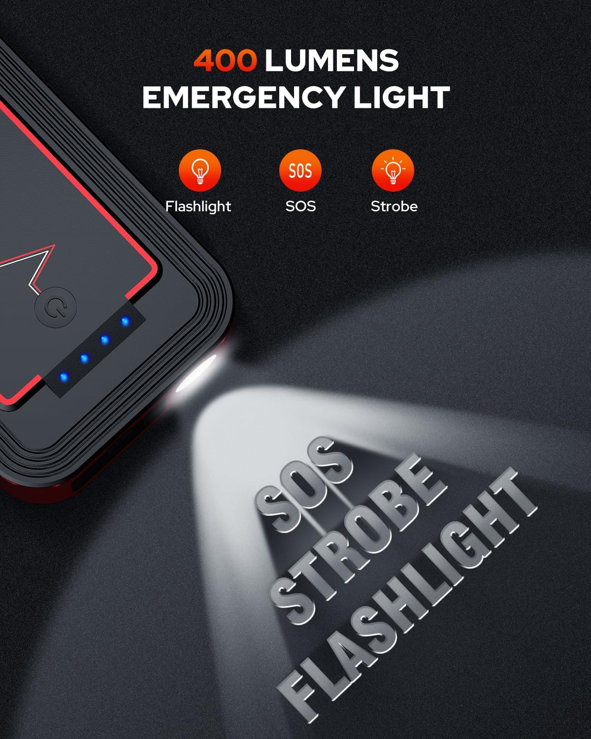 - ✅ALL IN ONE jump starter - This jump start battery pack integrates 4 practical functions to meet all your needs, including car emergency starting, 400-lumen LED lighting(stable, strobe, and SOS), Power bank 20000mAh with QC3.0 fast charging, and 12-16V/6A DC port to power your 12V vehicle-mounted devices. while it's only weights 1.2pounds, Say goodbye to old bulky jump start battery pack NOW!
