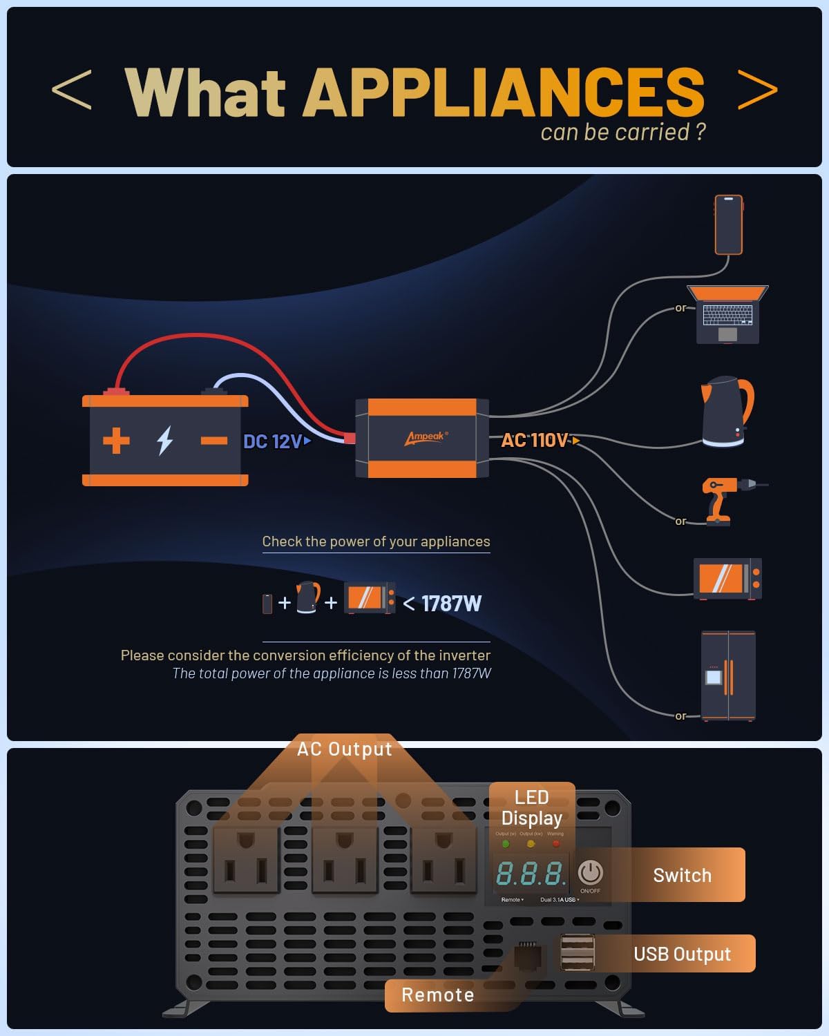 - Modified Sine 2000W Inverter: Provides 2000W continuous power and 4000W peak power,12v to 110v converter. Includes Dual 5V/3.1A USB Ports and 3 AC outlets (each supporting 2000W, efficiency considered), with 2 feet of 4AWG battery cables.