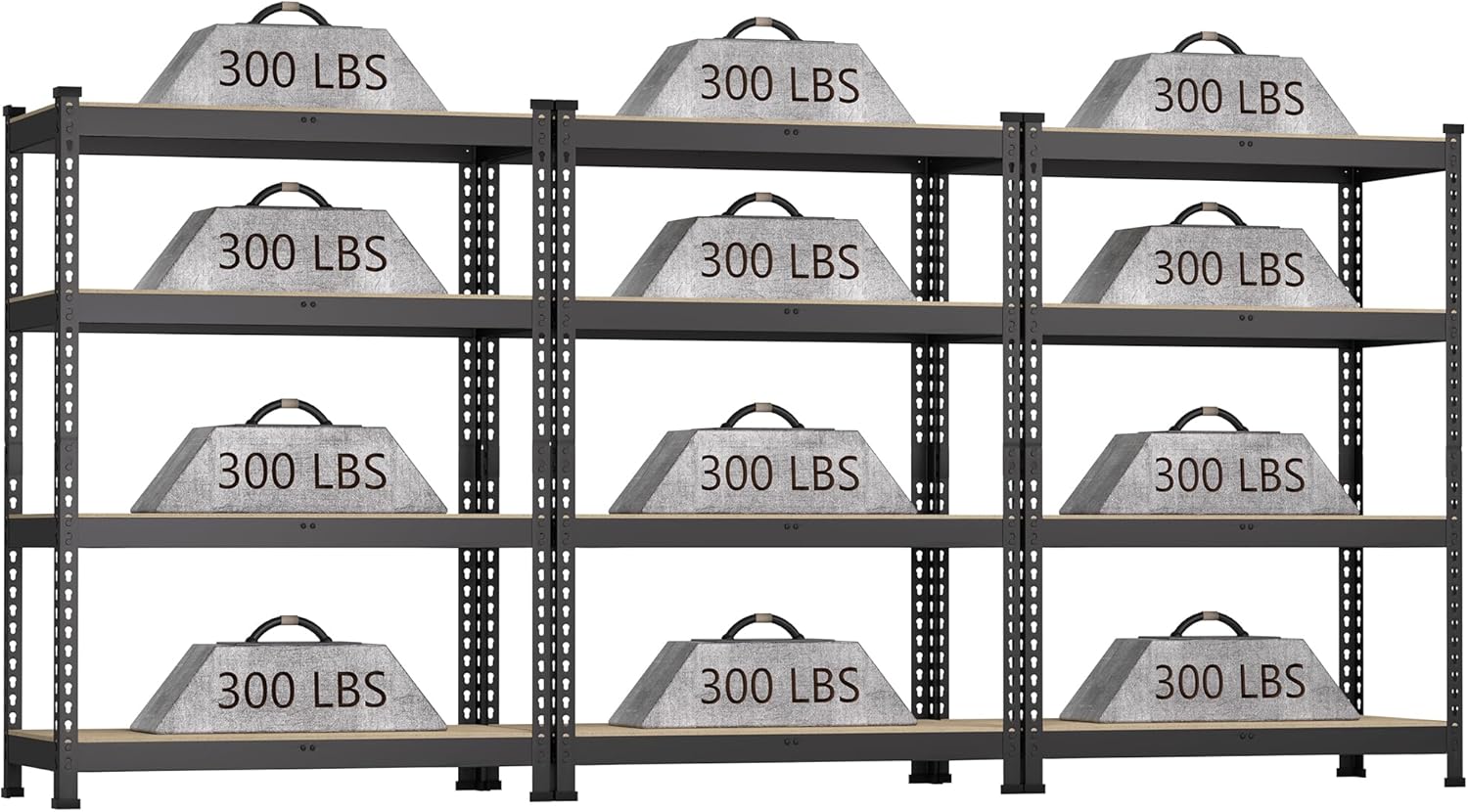 - - Size & Weight Capacity: Storage shelves' 1 pack size: 36" W x 16" D x 55" H. Built from the highest-quality metal, this garage shelving unit Max. load capacity is 300 lbs per layer shelf (evenly distributed) without buckling or breaking, 4 tier shelves' total max load capacity is 1200 lbs