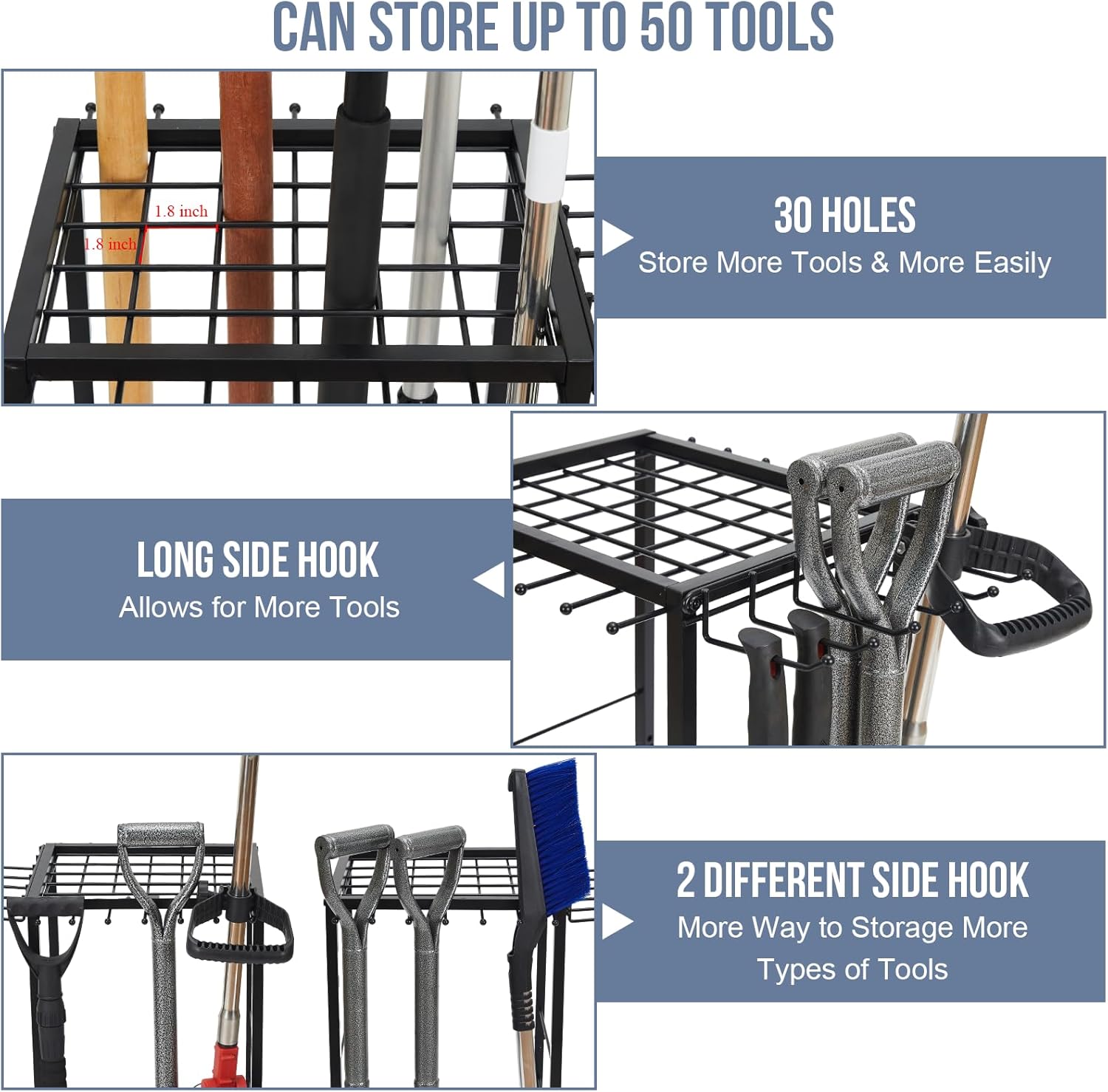 - Multifunctional Garden Tool Organizer: Garden tool storage can organizes up to 50 garden tools, including yard tools, farm tools, lawn tools, and cleaning equipment etc. Provide large capacity in a compact size. It simplifies tool storage and organization. Height-adjustable feet suitable for uneven ground. Suitable for garage, garden, shed, outdoors and backyards