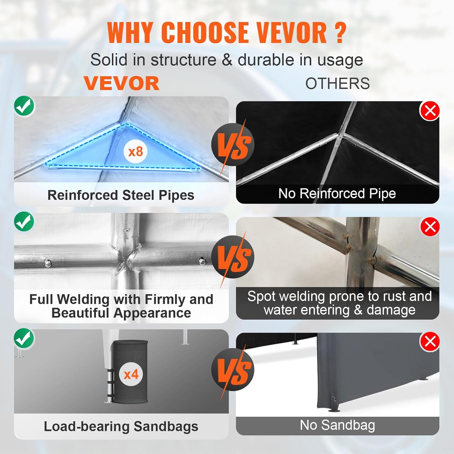 VEVOR Upgraded 10x20 ft Heavy Duty Carport Car Canopy, Car Port Garage Boat Shelter Party Tent with 8 Reinforced Poles and 4 Weight Bags, UV Resistant Waterproof Tarp for SUV, Truck, Boat