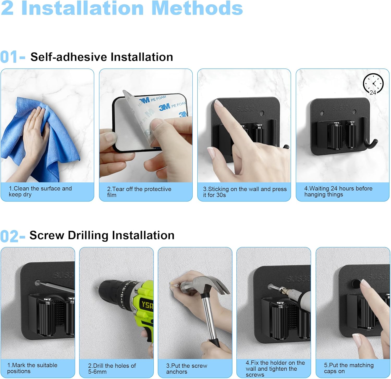 - 【Versatile Installation】Broom and mop organizer wall hanging are designed with self-adhesive & Screw Drilling Installation 2 In 1, providing you with the flexibility to choose the perfect installation method for your needs.