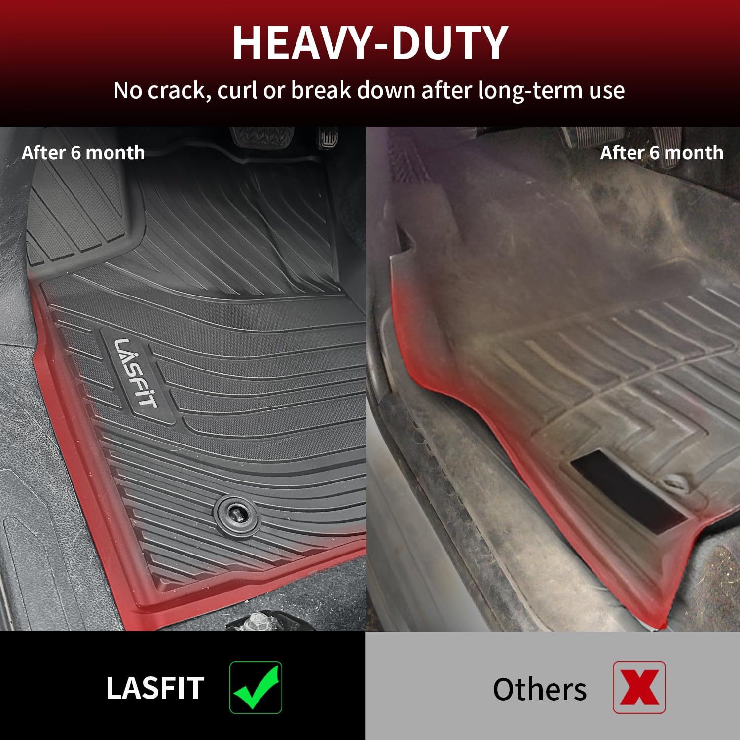 - ALL WEATHER PROTECTION - Lasfit Tacoma floor mats Shield your floor from dirt, mud, salt, rain, snow, and even hot summer temperatures. Cleaning up daily wear and tear off our car mats is a breeze.