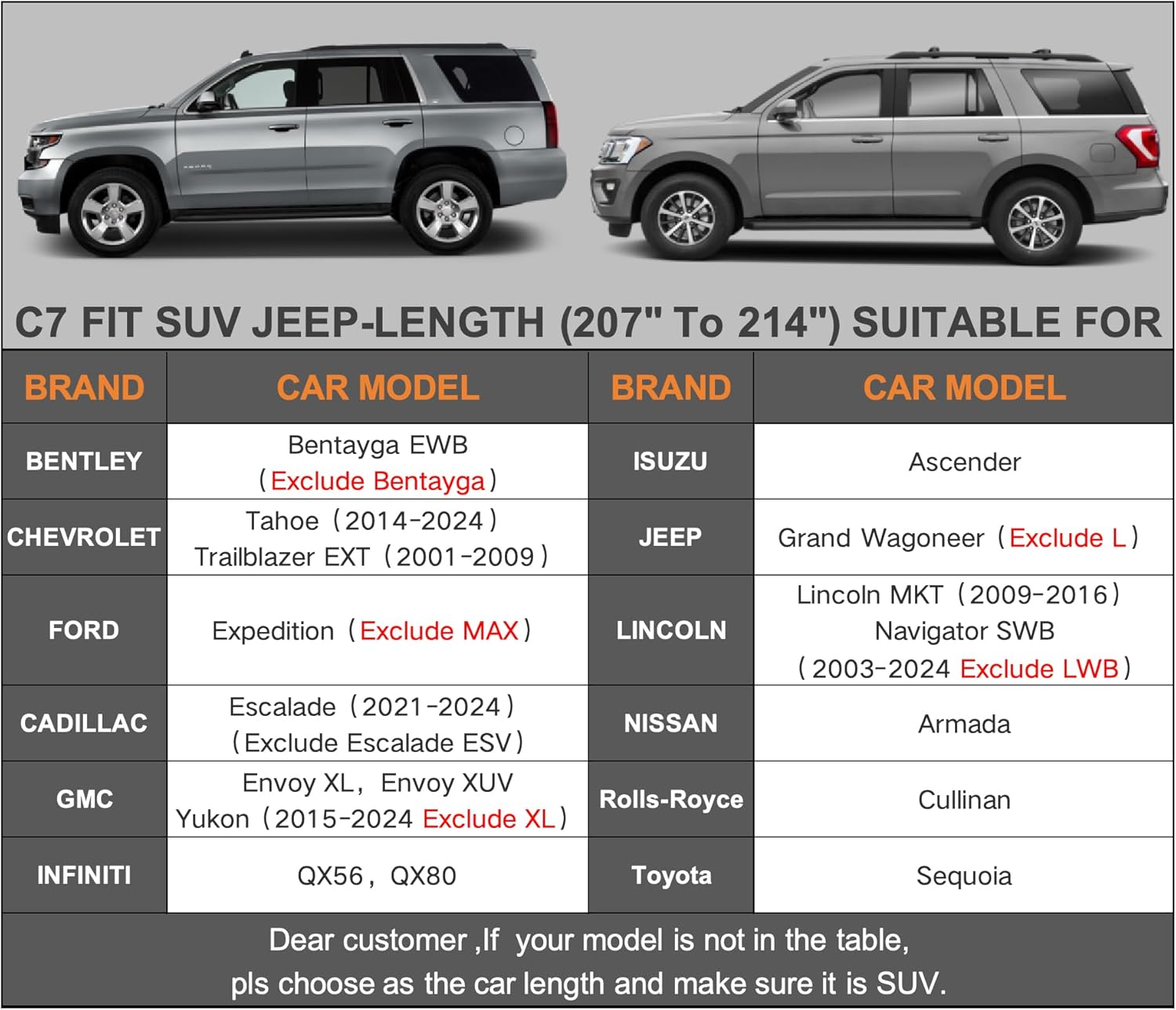 - 【Dimension C7】Universal fit for Suv which length is 207-214 inch (Not for hatchback and sedan). Suitable forInfiniti QX56 QX80, Ford Expedition, Nissan Armada, Toyota Sequoia etc.