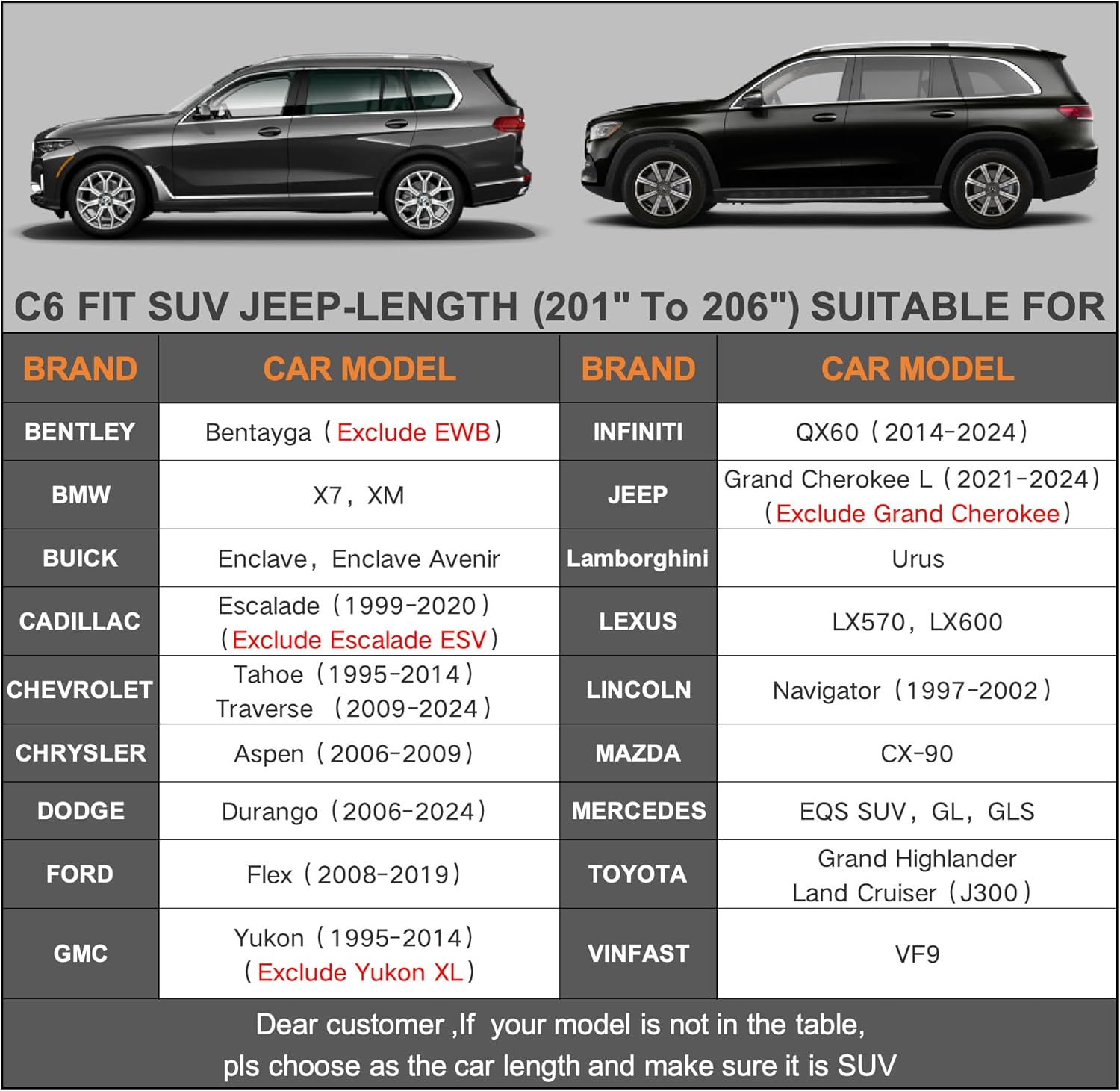 - 【Dimension C6】Universal fit for Suv which length is 201-206 inch (Not for hatchback and sedan). Suitable for BMW X7, Buick Enclave, Lexus LX570, Mercedes-Ben GLS etc.