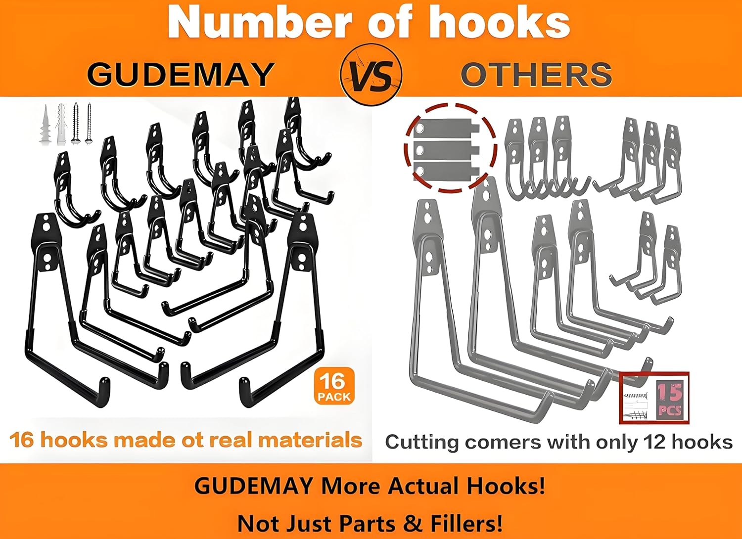- 【MULTI-FUNCTIONS GARAGE HOOKS】GUDEMAY garage hanging hooks are the ideal solution to help utilize your vertical storage space more effectively, get everything organized, and find what you need at a glance. Great for ladders, lawn trimmers, gardening equipment,and so much more! Compared with single hooks, our garage storage utility hooks have two holes to easily hold the weight enabling most items to be hung