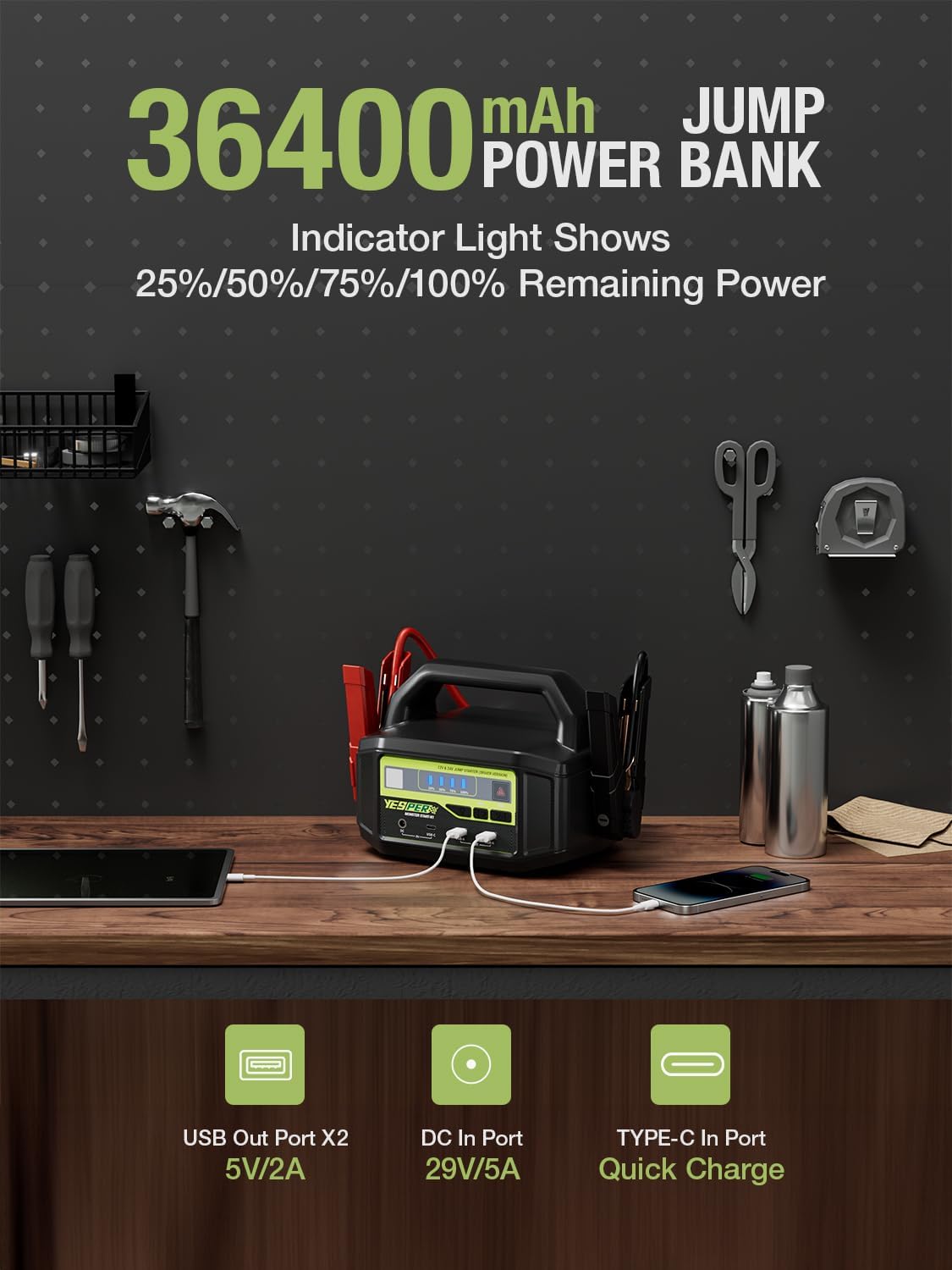 - [Beyond A Jumper Starter] - Serves as a 36400mAh portable power bank, with Dual USB charging ports, you can provide power to 2 devices at the same time; As a light, it has three different modes including: Lighting, Strobe and SOS, which can provide 160 hours of continuous lighting