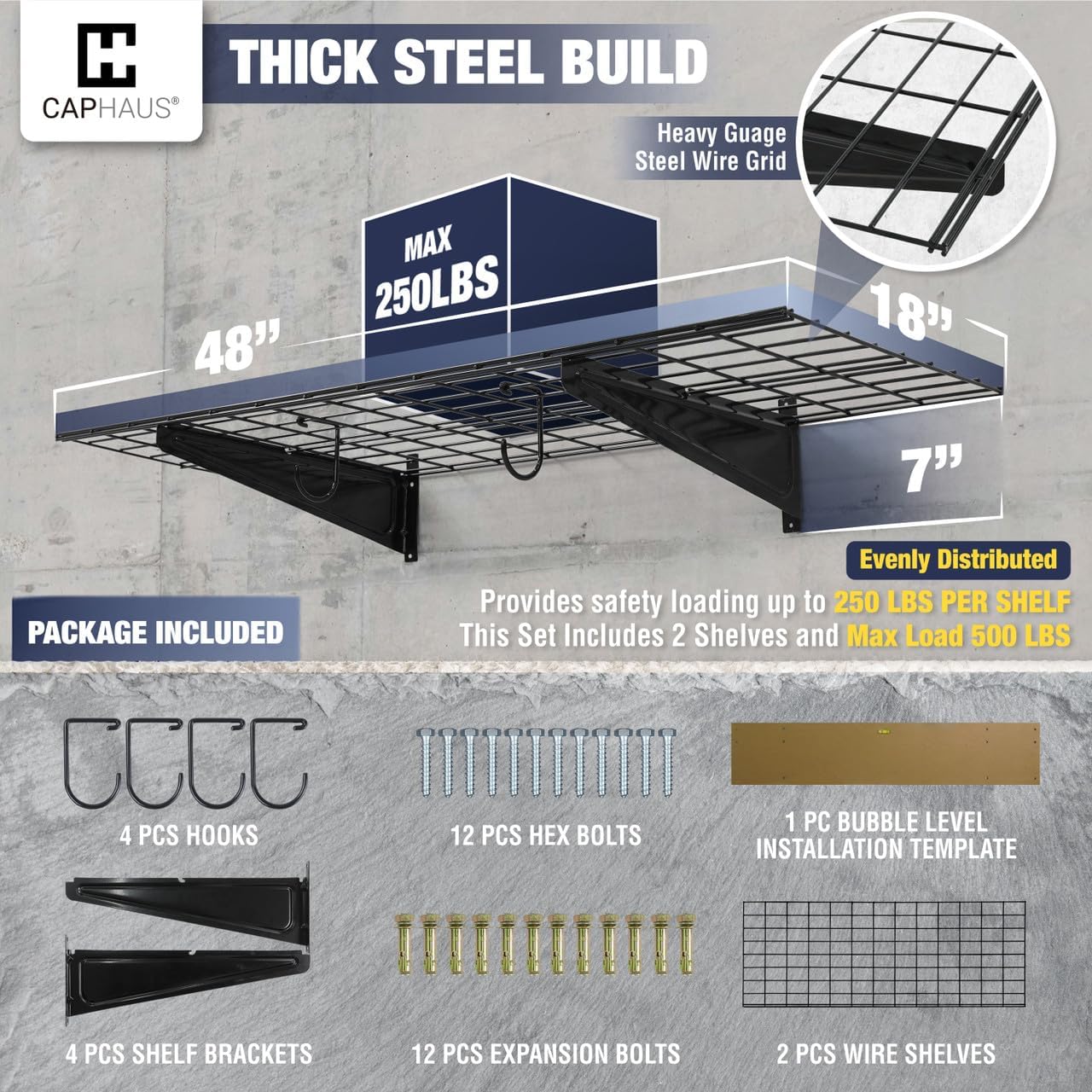 - 🔨 Robust Steel Construction - Our garage wall shelving set includes wire shelving and wall brackets with a durable powder-coated finish, marrying a sleek look with sturdiness. The intelligent design of our steel storage rack allows overhead storage and accessory hook usage, maximizing garage space and organization. We provide high-quality screws that have undergone rigorous testing to ensure durability. Each hook included in the package has a weight capacity of 33 lbs.