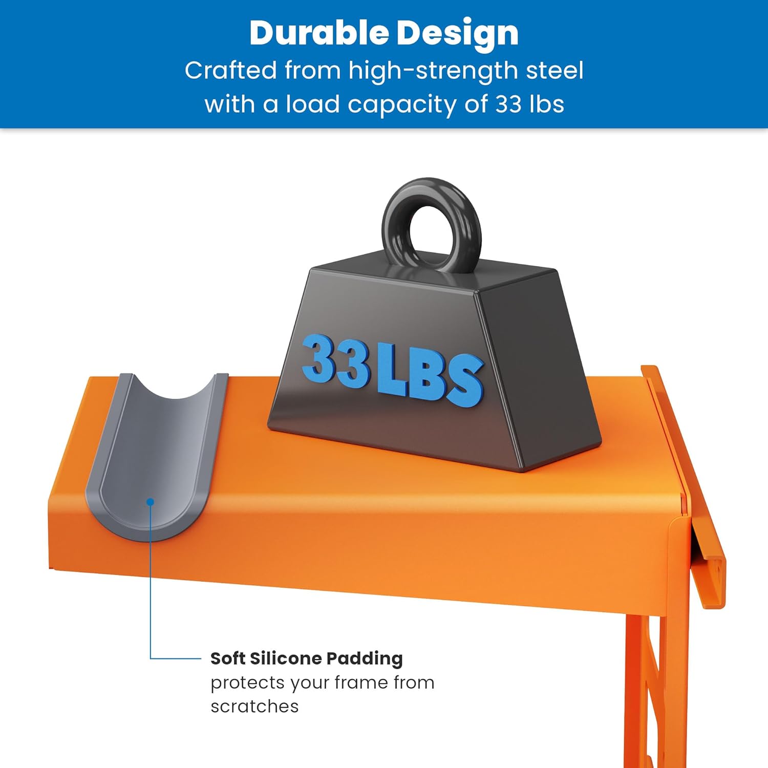 - SAVE FLOOR SPACE: Elevate your bike storage and free up valuable floor space with this hanging rack and shelf that is stylish and functional at the same time. Compatible with road bikes and other bicycles with a crossbar diameter up to 2.2" and handlebars up to 23.6" wide. The soft silicone padding ensures your crossbar is protected from scratches and scuffs.