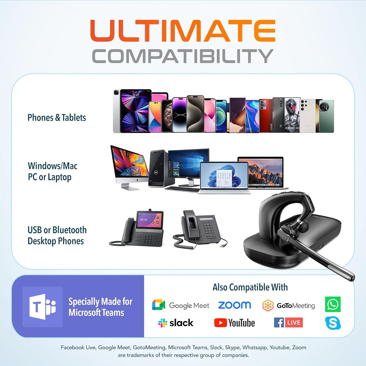- Effortless Control and Versatile Charging Options: This bluetooth earpiece boasts intuitive controls, including volume adjustment, power toggling, mic muting, and a multi-functional button for seamless operation on Microsoft Teams and other platforms. Our wireless noise cancelling headset with mic offers two-way charging, which allows you to charge with the case or directly through a USB-C cable, catering to the dynamic needs of modern professionals.