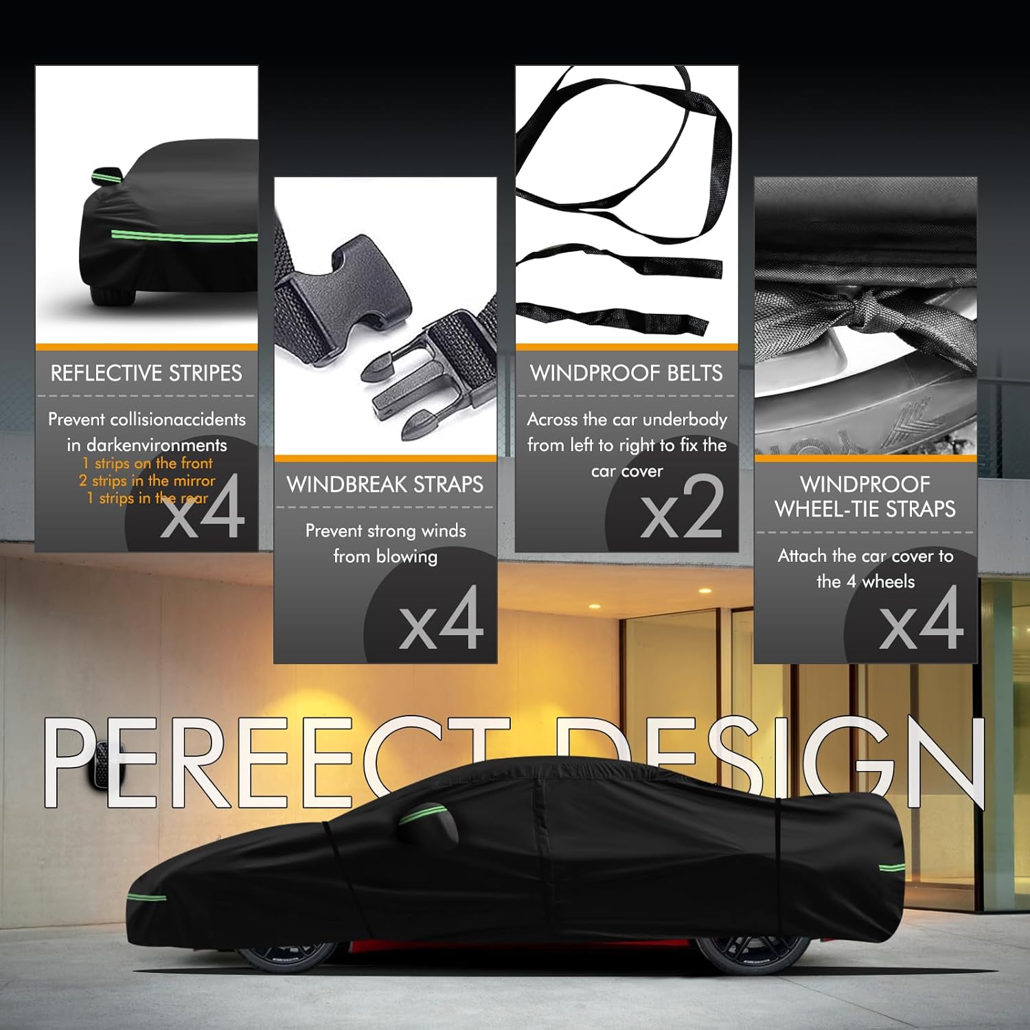 - 🚘【Safety and Humanization】①The car protection cover has a zipper on the driver's side to facilitate temporary access to items; ②The four reflective strips are located at the front, rear and the two side mirrors of the car to prevent nighttime collisions and other accidents; ③Custom fit shape with 2 mirror pockets for all-around protection.
