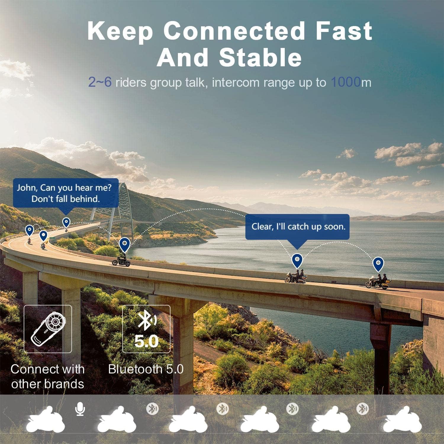 - ◼【No More Lonely for Both Alone and Team Ride】Using Bluetooth 5.0 + A2DP EDR deep transmission optimization, this Bluetooth headset motorcycle solve disconnection & stuttering on the go. Up to 6 buddies communicate the latest road condition and plan up to 3280ft away ( 656ft for one-to-one intercom). You also get crisp music, FM and hands-free call. Convenient voice command keep your focus on the most important thing: safely riding, or should I say, enjoy the ride and scenery arounds you.