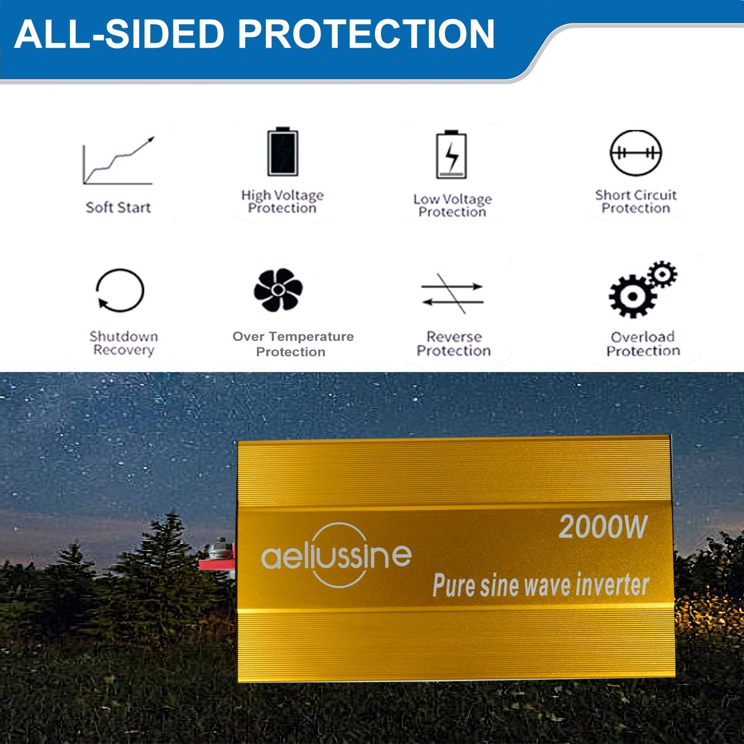 - 【Fully Safety Protections】The pure sine wave inverter has high efficiency and stable performance. It has sound protections including overload protection,over current protection, short circuit protection, battery reverse connection protection, high temperature protection, high or low battery input protection, built-in fuse protection.