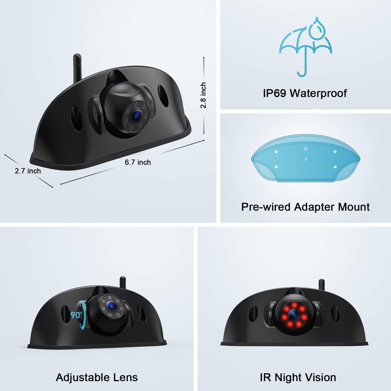 - IP69 Waterproof Camera with Night Vision: The HD camera with IP69 waterproof and 120-degree viewing angle brings you the best view and longer product life. Equipped with 6 infrared lights and a photoreceptor, the lights automatically turn on when the ambient light is low, it continuously provides you with high-definition images to ensure driving safety. Also, it is compatible with Furrion pre-wired mount, which will save your installation time.