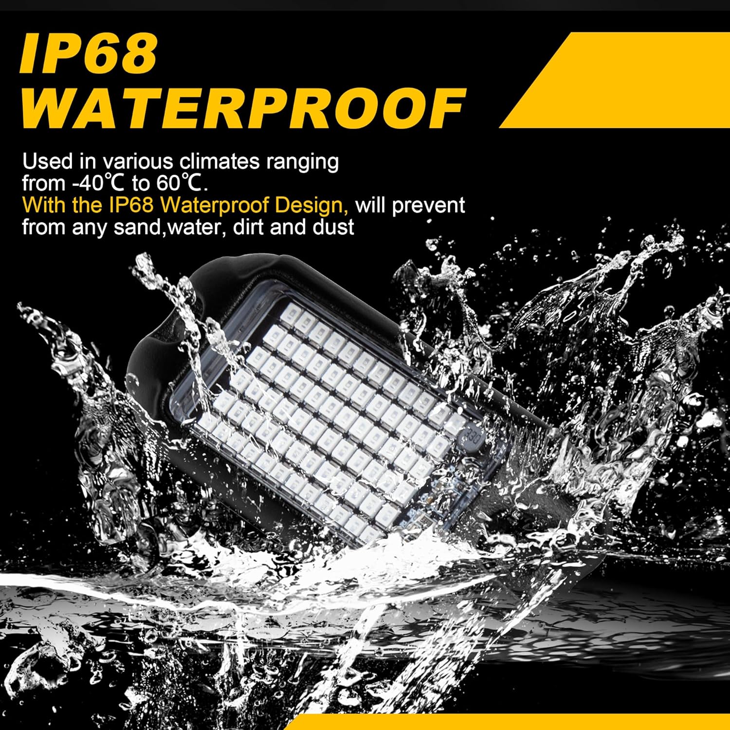 - Durable & Waterproof - Die-cast aluminum with black powder paint, more texture, faster heat dissipation, 50,000 hours lifespan and IP68 waterproof rating that are always ready for heavy rain, harsh snow, and rugged environments.No need worry about driving in rainy days or off-road driving. We tested the waterproof function and Winunite rock lights could work properly without any problem.
