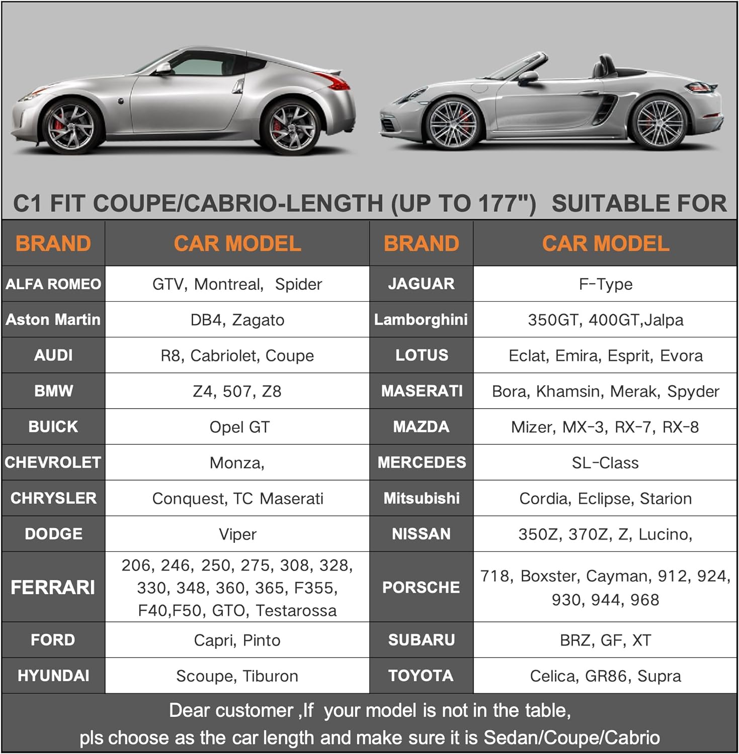 - 【Dimension C1】Universal fit for sedan/Coupe/Cabrio which length is 177 inch (Not for hatchback and SUV). Suitable Nissan Versa/350Z/370Z, Porsche 718 Cayman, Dodge Viper etc.