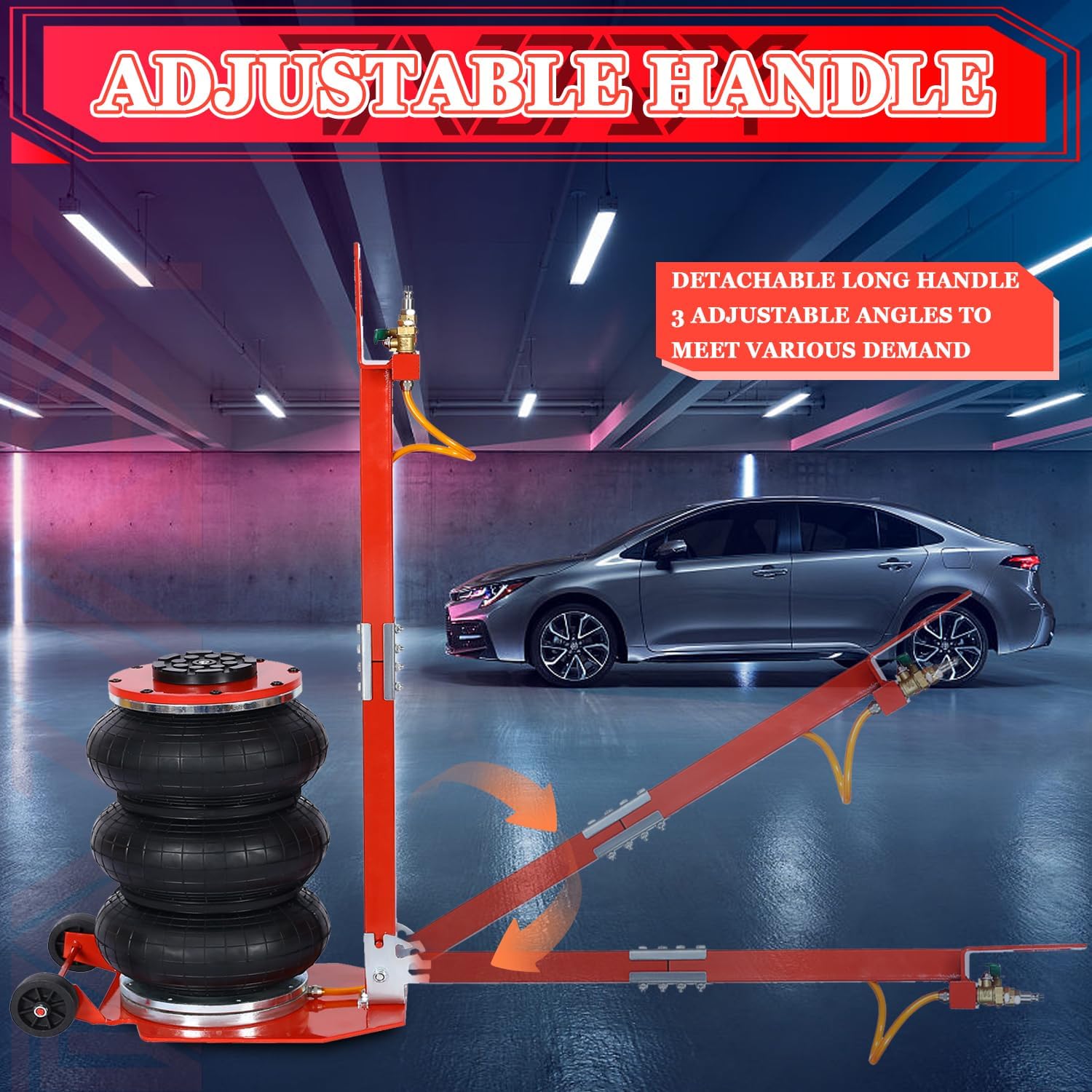 - PORTABLE AND COMPACT - The detachable long handle has 3 adjustable angles to meet your various demand. Two high quality casters make it portable and easy to roll around. The compact design and portability of Tandagy pneumatic airbag jack make it easy to transport and store whether on the road or in garage.
