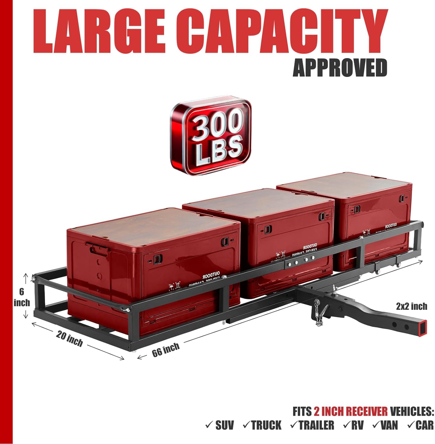 - LARGE HITCH CARGO CARRIER: Ideal for travel trailers and outdoor adventures, as a hitch rack, it boosts your vehicle's storage capacity during travel. As a hitch cargo rack, it measures 66x20x6 inches, offering ample space and strong load-bearing capability to haul camping gear, travling items and more