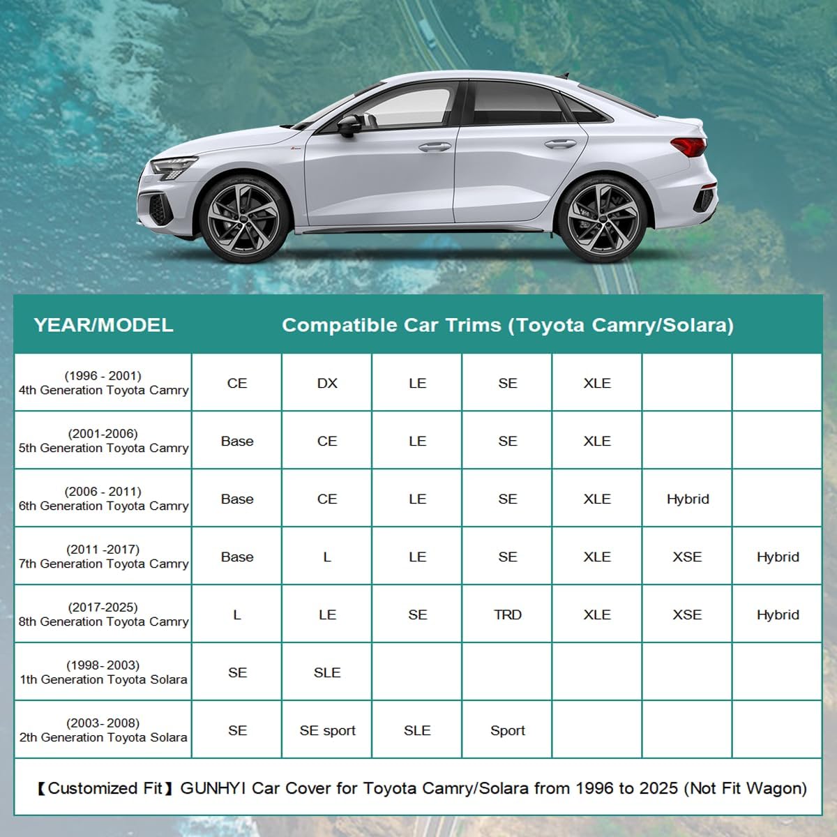 - 【Compatible with】This Full Car Cover Custom fit for Toyota Camry/Solara from 1991 to 2025. Comes with a microfiber towel that you can use to clean your car, because if there is sand on the surface of the car before use, it may damage the paint.