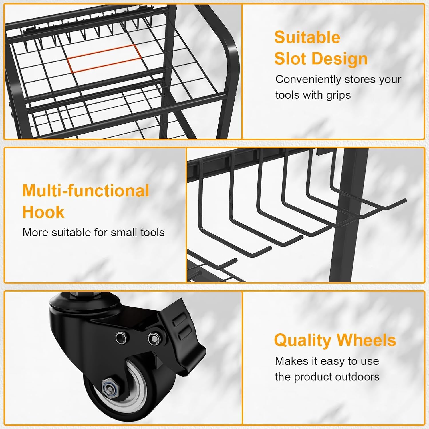 - Practical design- The garden tool organizer comes with 4 universal wheels.that smoothly move through thick grass and can easily be moved from indoors to outdoors. Efficiently organizes space in your garage and shed when used indoors,You can also use this garden tool rack when working in the garden, he can transport many tools together at the same time to where you are working, saving you the time and trouble of going back and forth to get the tools.