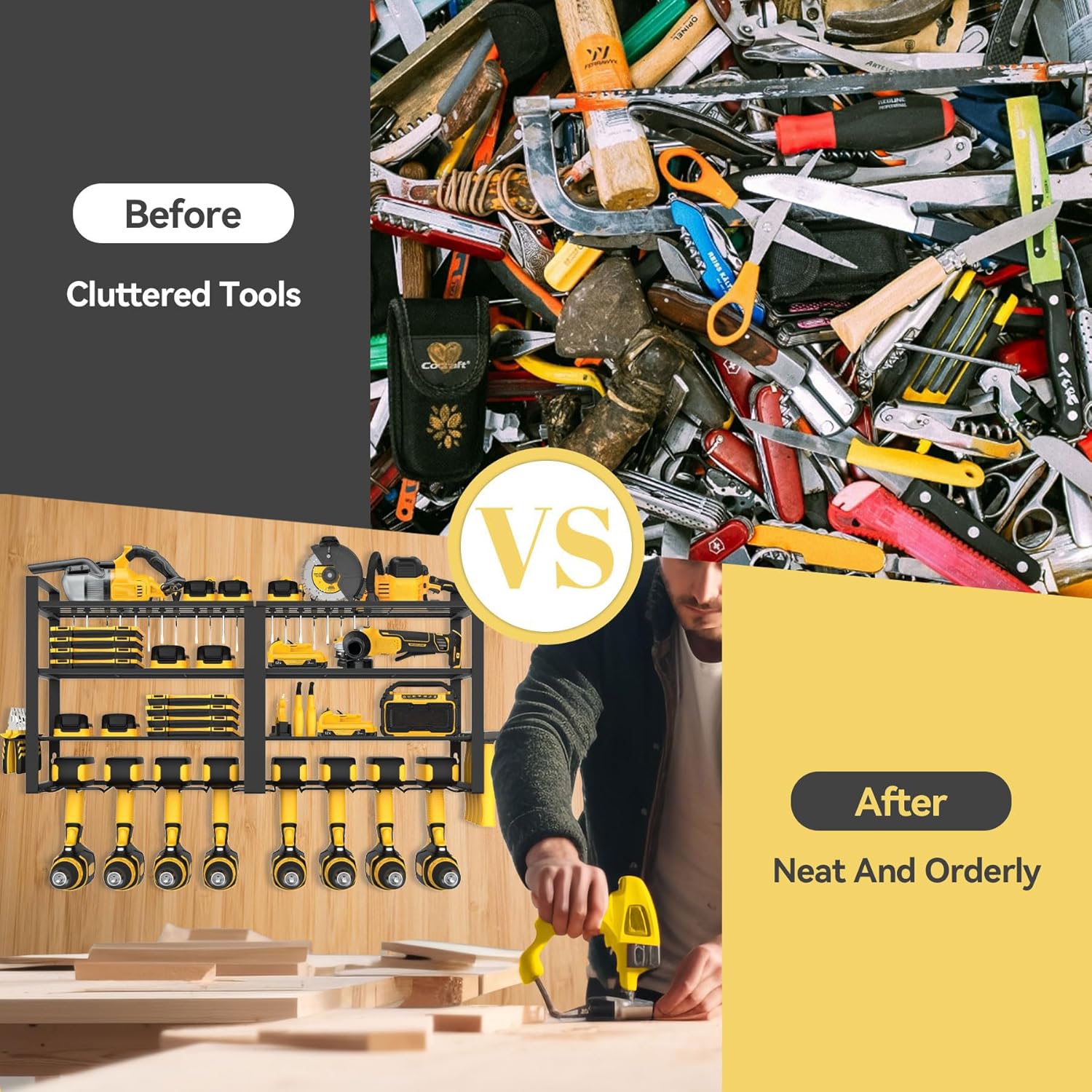 - Lage-Capacity Storage Design:The power tool organizer features a four-tier high-capacity design, dimensions is 32.28'' L X 7.87'' W X 14.96'' H. providing ample space for storage. The First layer features plenty of screwdriver holes for neatly arranging your screwdrivers, The second and third layer can store your charging stations, batteries, toolboxes and various tools, while the bottom layer accommodates 8 cordless drills.Additionally, side holders for hammers and pliers enhance organization