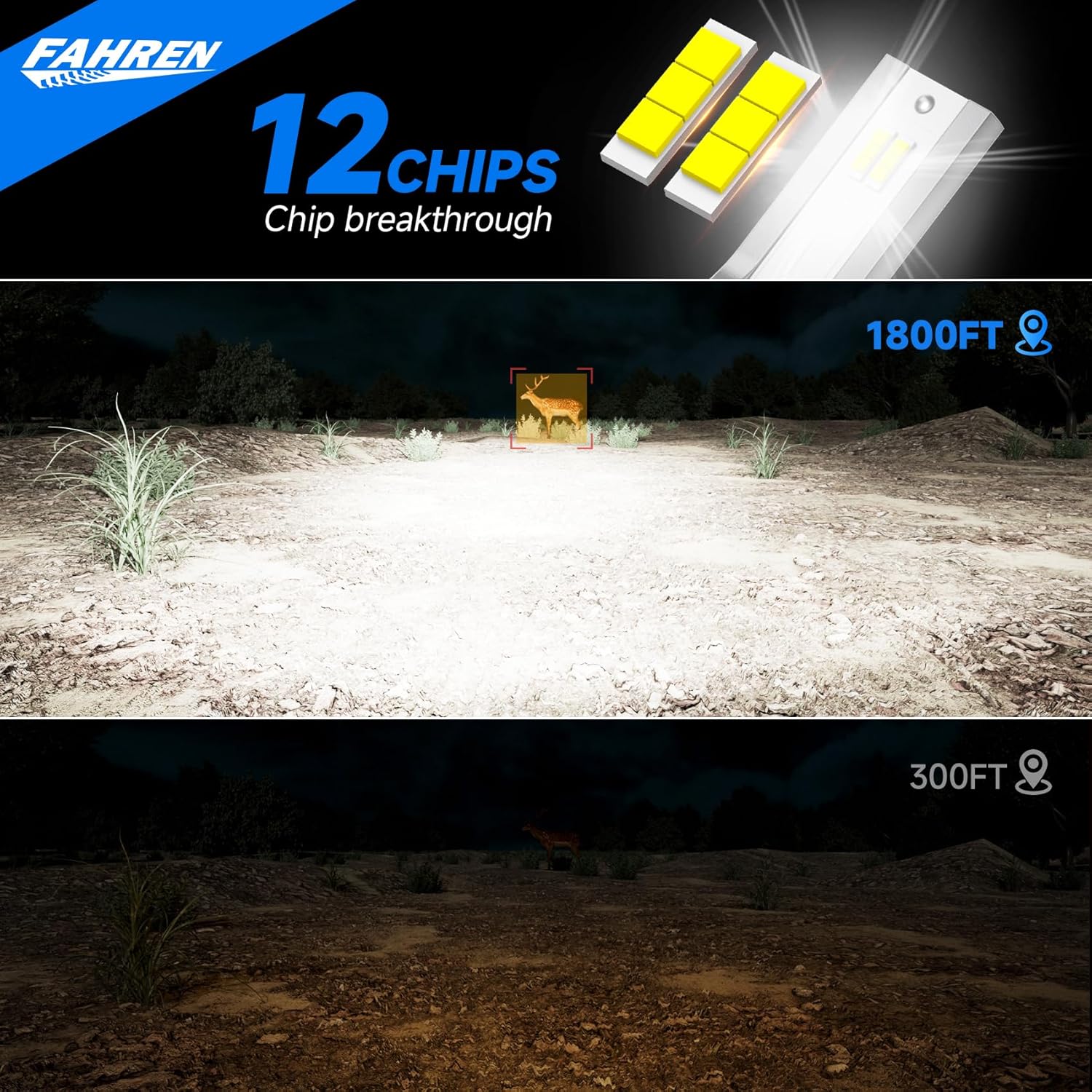 - 【800% Brightness】The FAHREN 9007 lights have automatic upgrade chips, with 6500K cold white light and 33,000 lumens, It provides 8 times more brightness than other 9007 bulbs, you can clearly see the road signs of animals on the road, ensuring your safe driving at night.