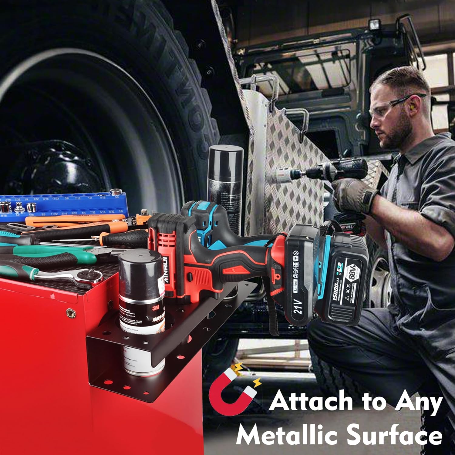 - [Easily to Install] No drilling holes on the wall! The magnetic power tool organizer and shelves can be temporarily fixed in a garage, workroom, or workstation and are easy to set up and release, making it the best removable power tool storage rack