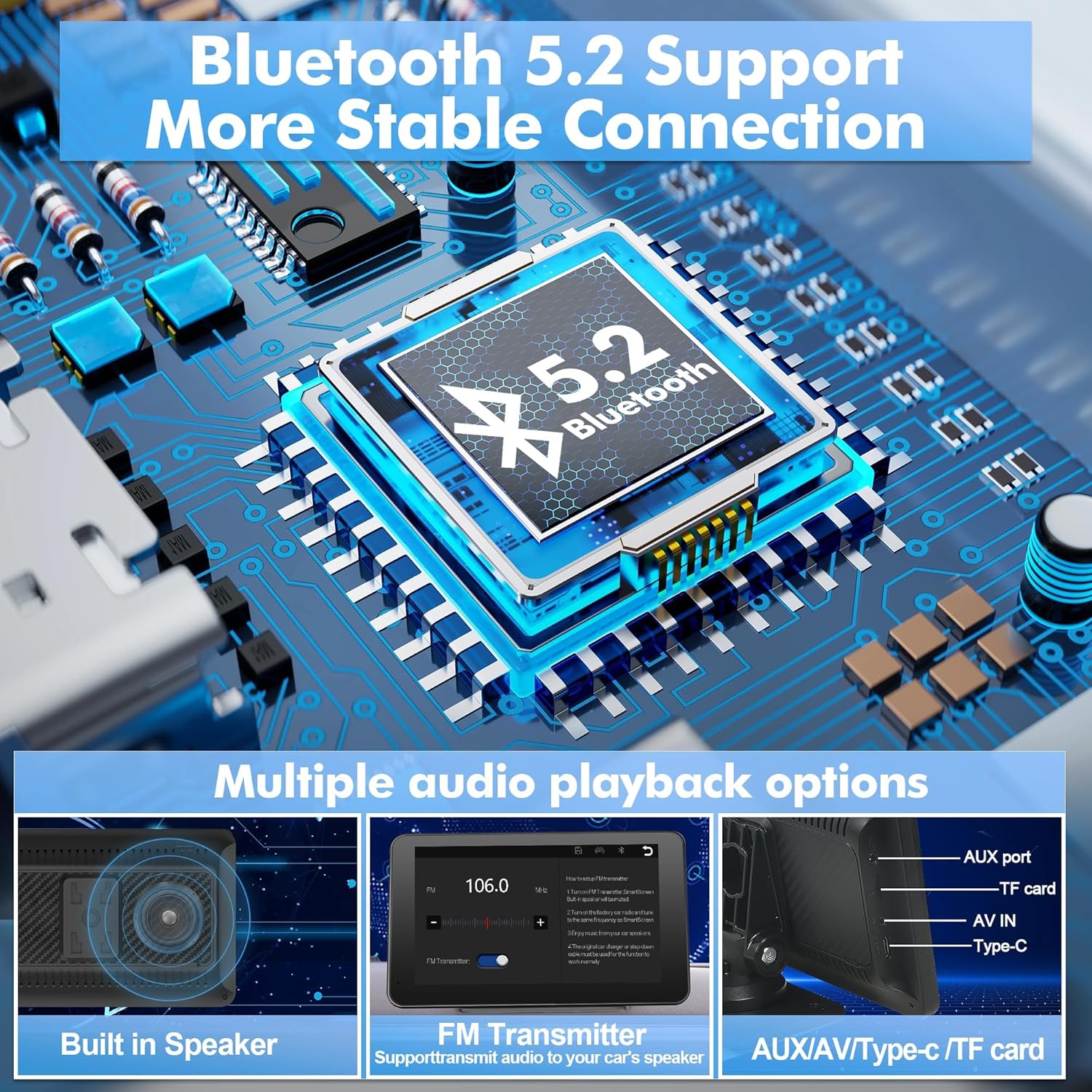 - 【Multiple Audio Output & Voice Control】-The portable carplay display drive play for cars can be controlled through Siri/Google Voice Assistant. No need to touch the android auto head unit car screen if you want to answer the phone, play music and read message, and you just say the command. What's more, the car radio receiver comes with FM transmission and built-in stereo speakers with AUX car stereo audio cable input, allowing you to enjoy an excellent music listening experience.