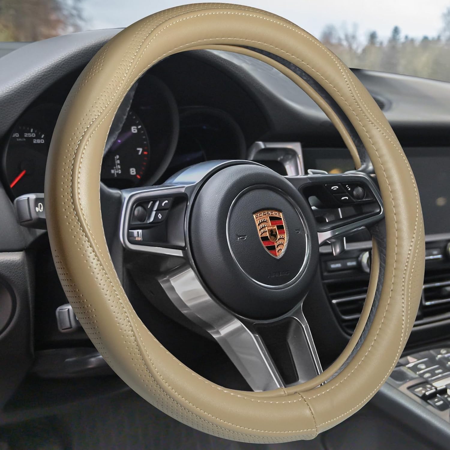 HAOKAY Top Grade Beige Genuine Leather Steering Wheel Cover Men Women, Luxury Steering Wheel Cover for Cars, SUVS and Trucks, Universal 14.5-15 inch
