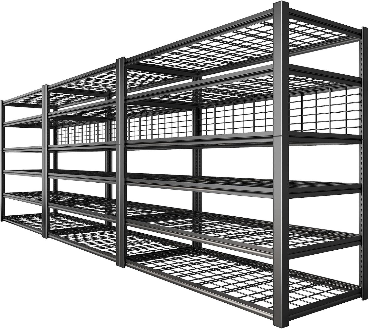 - 【3500LBS Capacity Garage Shelving Heavy Duty】600LBS max load per a shelf, wire shelving has thickened double metal legs. Made of high-quality metal, each solid thickened metal heavy duty shelving with 7 big ribs beneath, which makes industrial garage shelves heavy duty more stable and solid than flimsy wood board heavy duty shelves, and more stuff can be stored.
