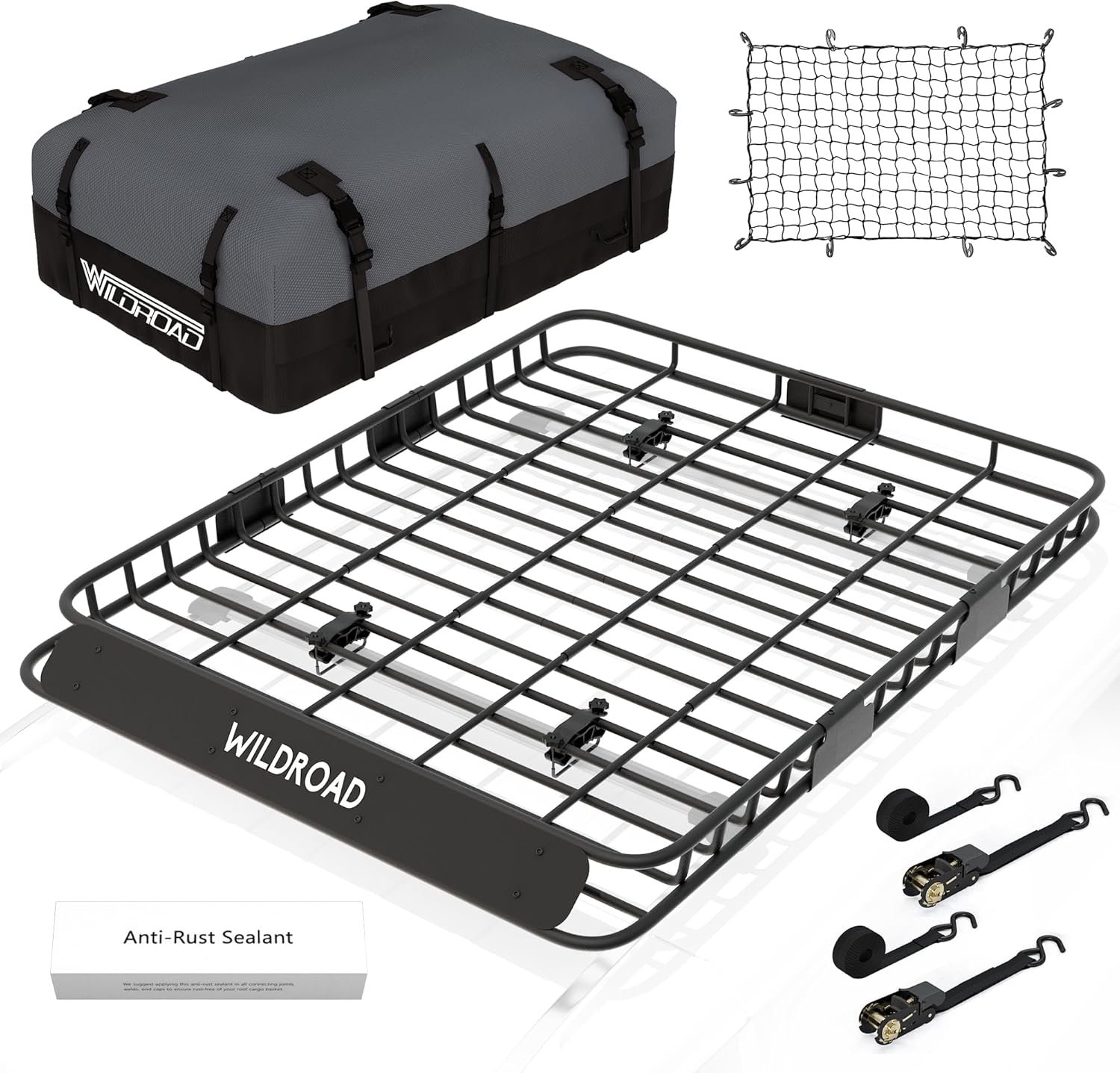 Wildroad Roof Rack Cargo Basket, Upgraded 4” Fence Wide Car Roof Basket Combo, 64"x 50"x 4" Universal Roof Cargo Carrier Basket with Cargo Bag, Cargo Net and Ratchet Straps Fits for SUV Truck Cars