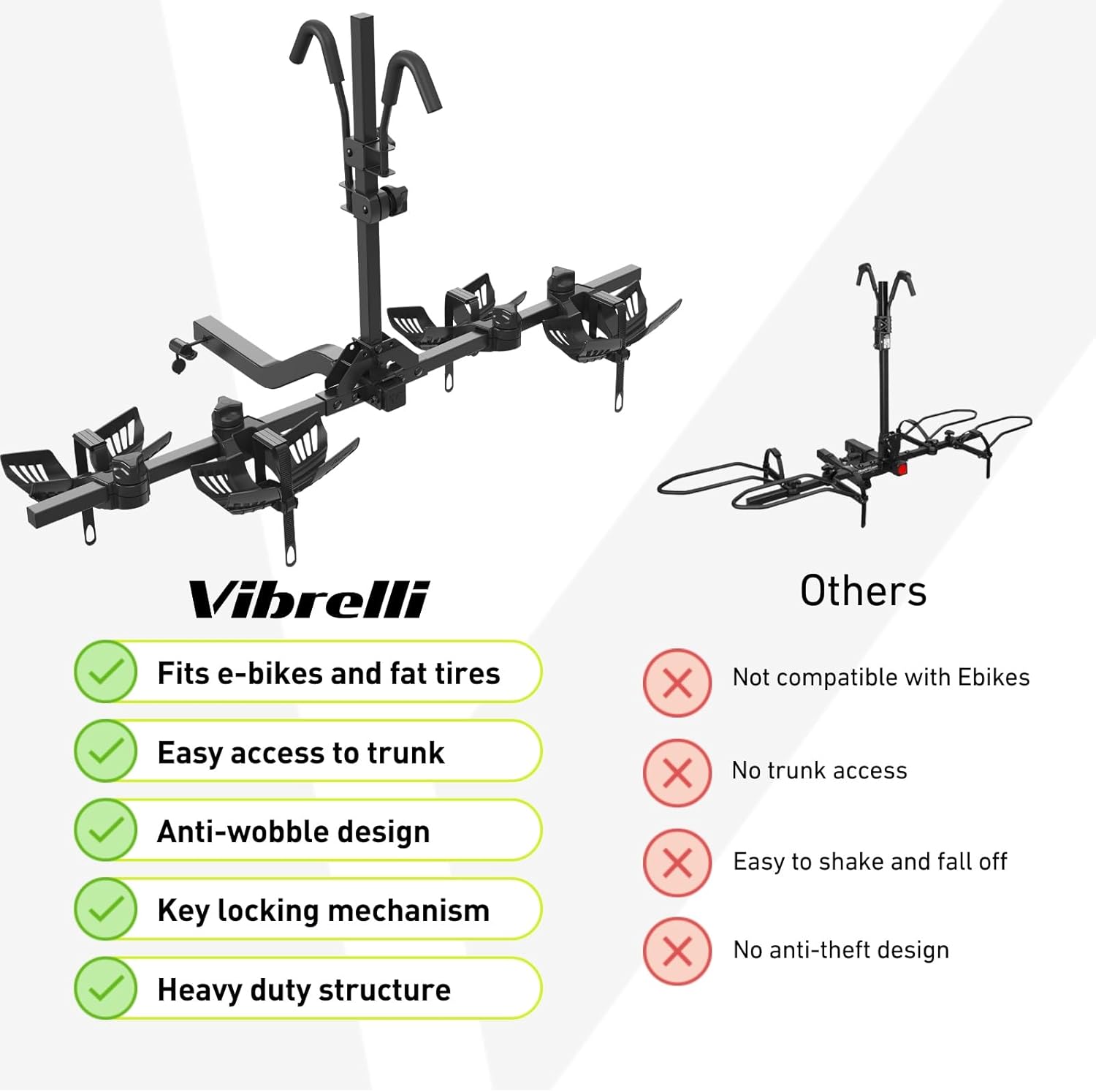 Vibrelli Hitch Bike Rack - 2 Ebike Rack - Fits Fat Tire, Mountain Bike, Electric Bikes, Road - 65lbs per Bike - Patented Anti-Wobble - Cars & SUV - Tilting Folding Platform Car Racks, 2-Inch Receiver