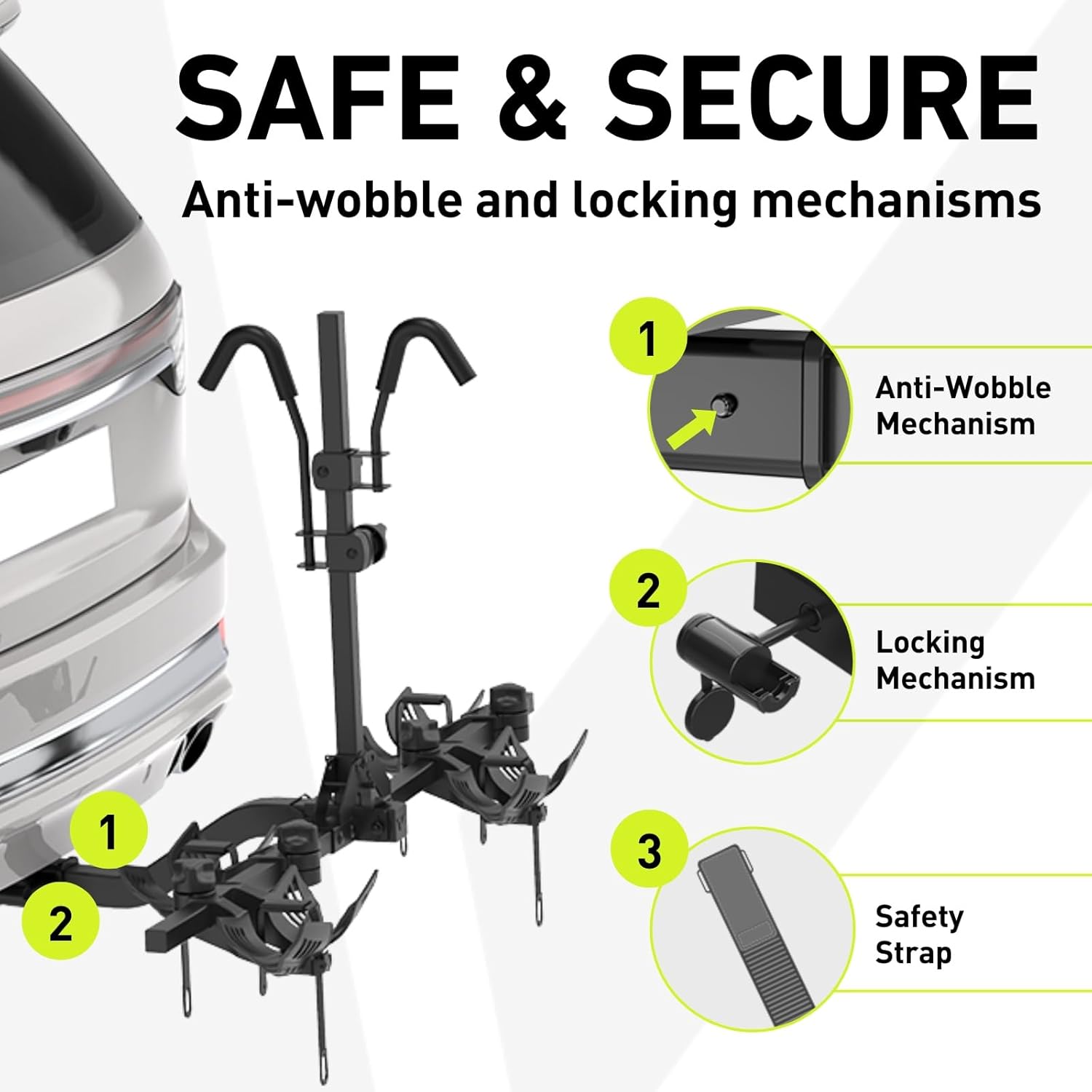 - LOCKING ANTI-WOBBLE HITCH - Locks the rack to your car hitch receiver to reduce movement. Enjoy a smooth rattle free journey