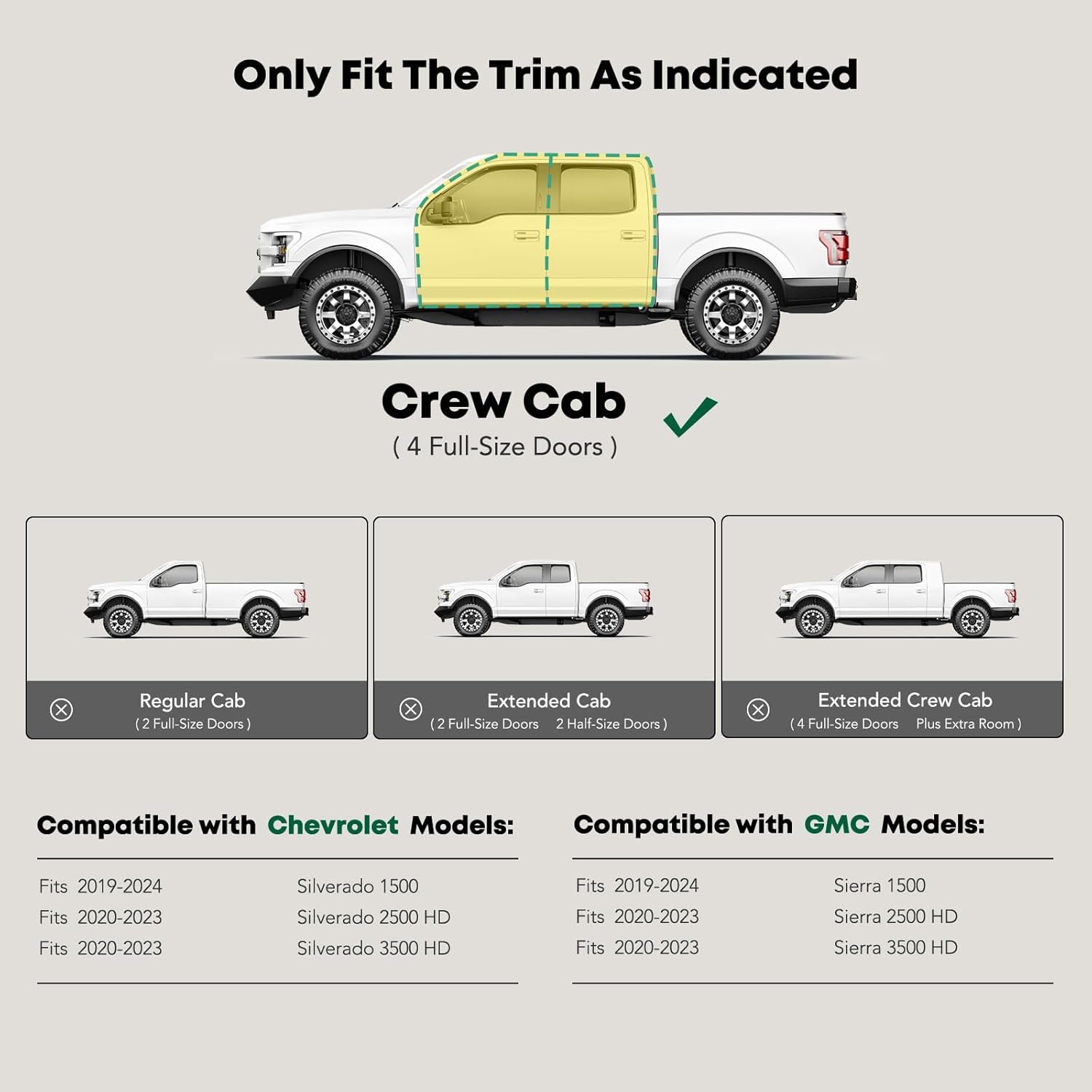 - Perfect Fit Side Bar: Our running boards are fit for Chevrolet and GMC Models: Silverado/Sierra 1500 2019-2024, Silverado/Sierra 2500 HD 2020-2024, Silverado/Sierra 3500 HD 2020-2024---Crew Cab Pickup (4 Full Size Doors); 6.5 FT Standard Bed Only. The wheel to wheel side bars extend the length from the cab to the rear wheels, with a total of 3 step pads on each side of the door and bedside for easy access from all positions