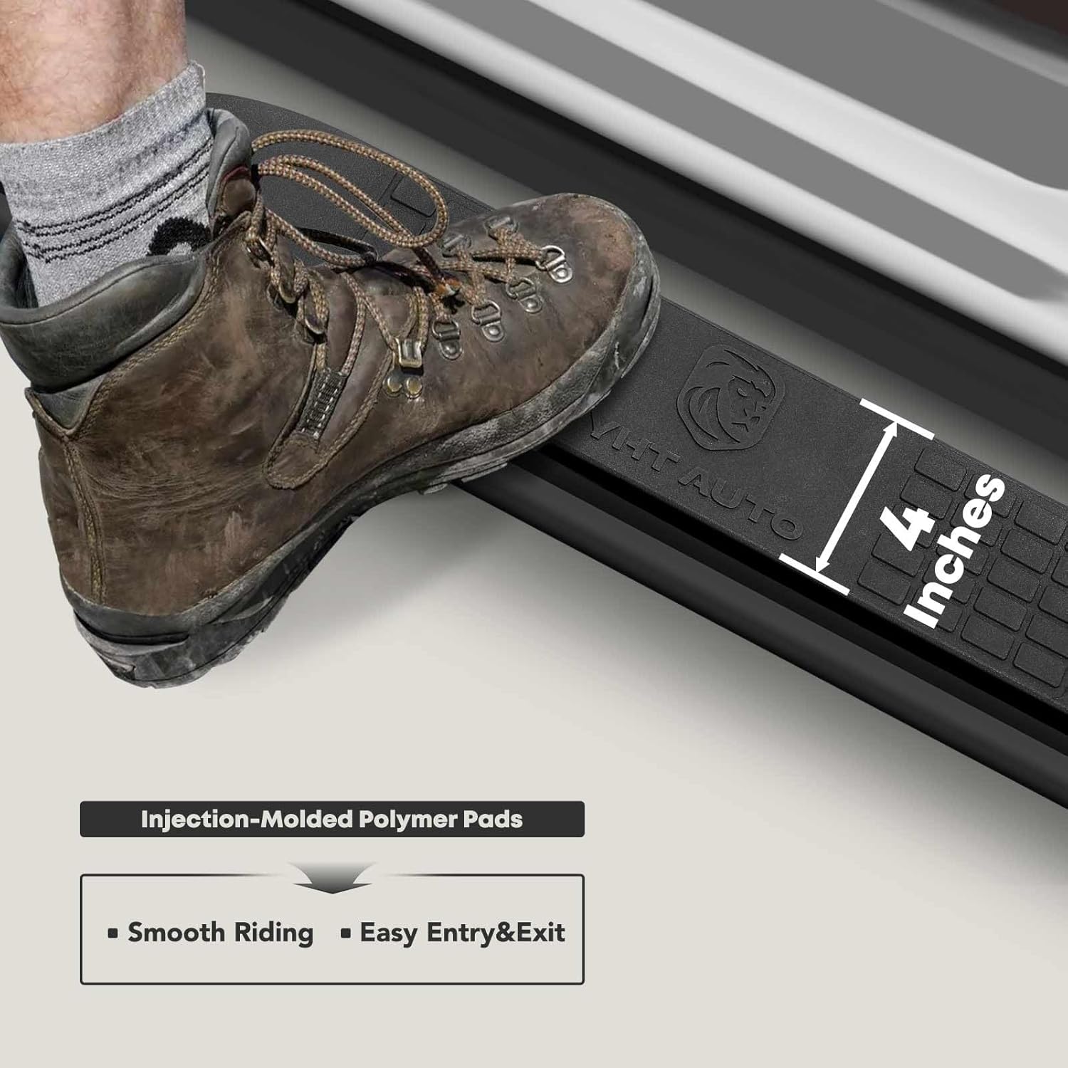 - Ultimate Comfort: The 4-inch injection-molded polymer step pads have undergone 10,000 dynamic load tests, 24 hours of static load testing, and 720 hours under the Xenon lamp aging test. These tests demonstrate minimal pedal surface drop and maintenance of structural integrity. Our sidebars are designed to preserve ground clearance.
