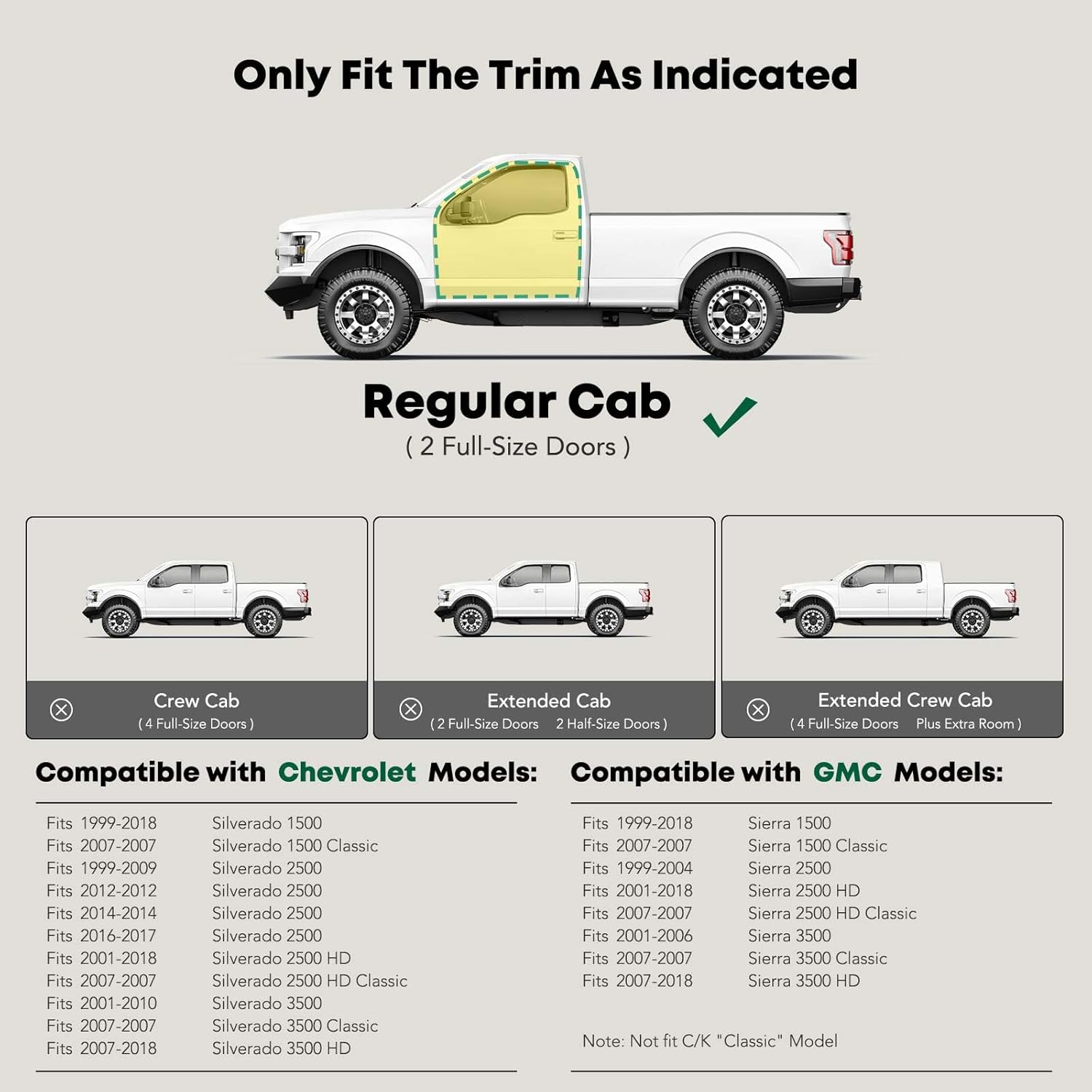 - Confident Fitment: Our side steps are compatible with Chevrolet and GMC Models: Silverado/Sierra 1500 1999-2018, Silverado/Sierra 1500 Classic 2007, Silverado 2500 1999-2009, 2012, 2014, 2016-2017, Silverado/Sierra 2500 HD 2001-2018, Silverado/Sierra 2500 HD Classic 2007, Silverado 3500 2001-2010, Silverado/Sierra 3500 Classic 2007, Silverado/Sierra 3500 HD 2007-2018, Sierra 2500 1999-2004, Sierra 3500 2001-2006---Standard Cab/Regular Cab(2 Front Doors); Excluding C/K Classic. Our excellent side