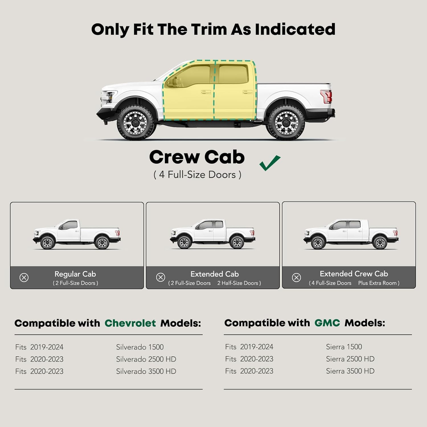 - Confident Fitment: Wheel-to-wheel side steps are compatible with the Chevrolet and GMC Models: Silverado/Sierra 1500 2019-2024, Silverado/Sierra 2500 HD 2020-2024, Silverado/Sierra 3500 HD 2020-2024, Crew Cab(4 Full-Size Doors), With 5.5 FT Short Bed only