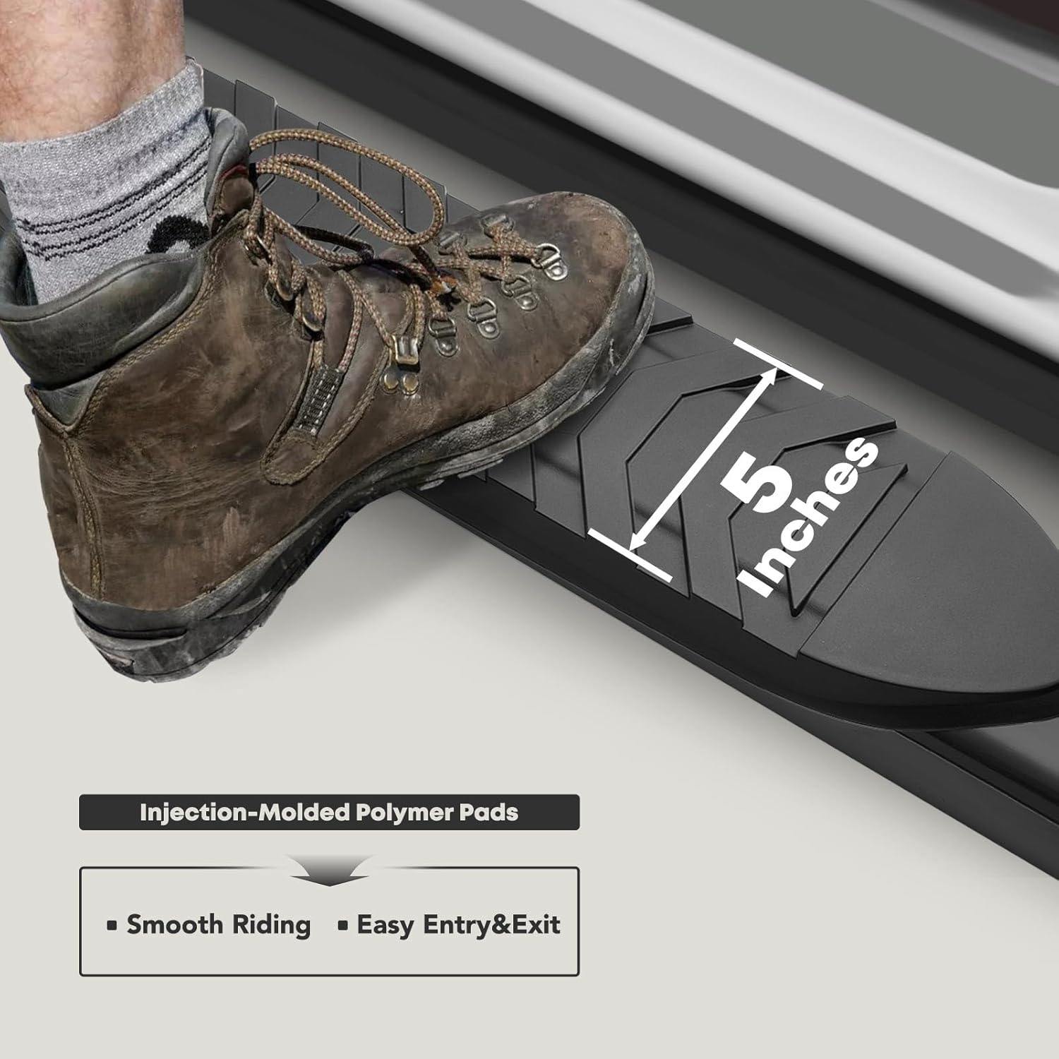 - High-Strength Steel: The step bars are crafted from high-strength Q235A steel and are enhanced with an electrophoretic layer and powder coating. This dual-layer protection greatly improves wear and corrosion resistance, while also imparting a sophisticated appeal