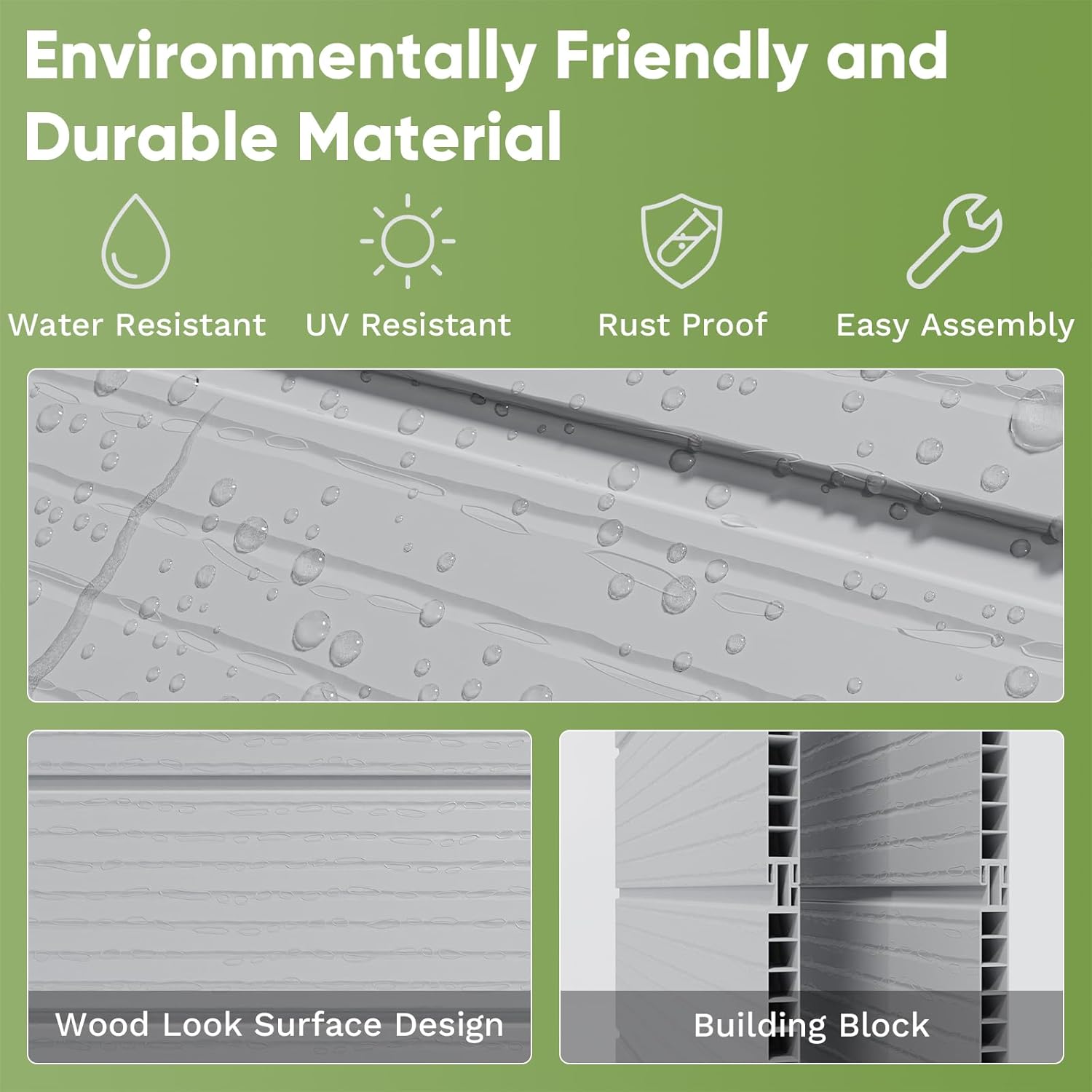 - Durable Material and Stable Construction: Crafted from durable resin material, this shed offers excellent weather resistance, ensuring your belongings stay safe and protected year-round.Designed with strength and stability in mind, the reinforced walls and sturdy floor of the storage shed can withstand heavy loads and resist warping or cracking. The UV-resistant exterior prevents fading, keeping the shed looking new and vibrant even after prolonged sun exposure.
