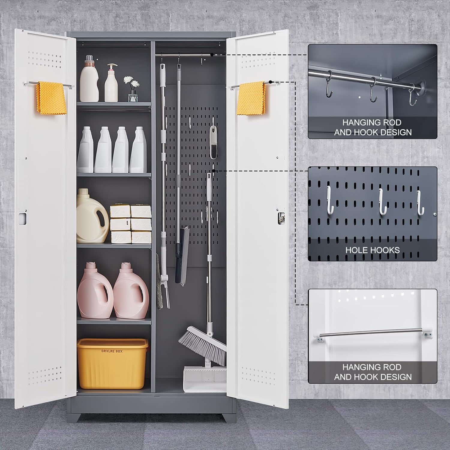 - 【Versatile Use】This cleaning metal storage cabinet comes with multiple accessories to meet your needs. Adjustable shelves accommodate items of varying heights. The right side is equipped with a hanging rod and S-hooks, and the hanging rod on the door can be used for towels and other items. The perforated panel design makes it easy to store and retrieve tools, keeping the space tidy and organized. The cabinet can store documents, brooms, mops, tools, towels, clothes, and more.