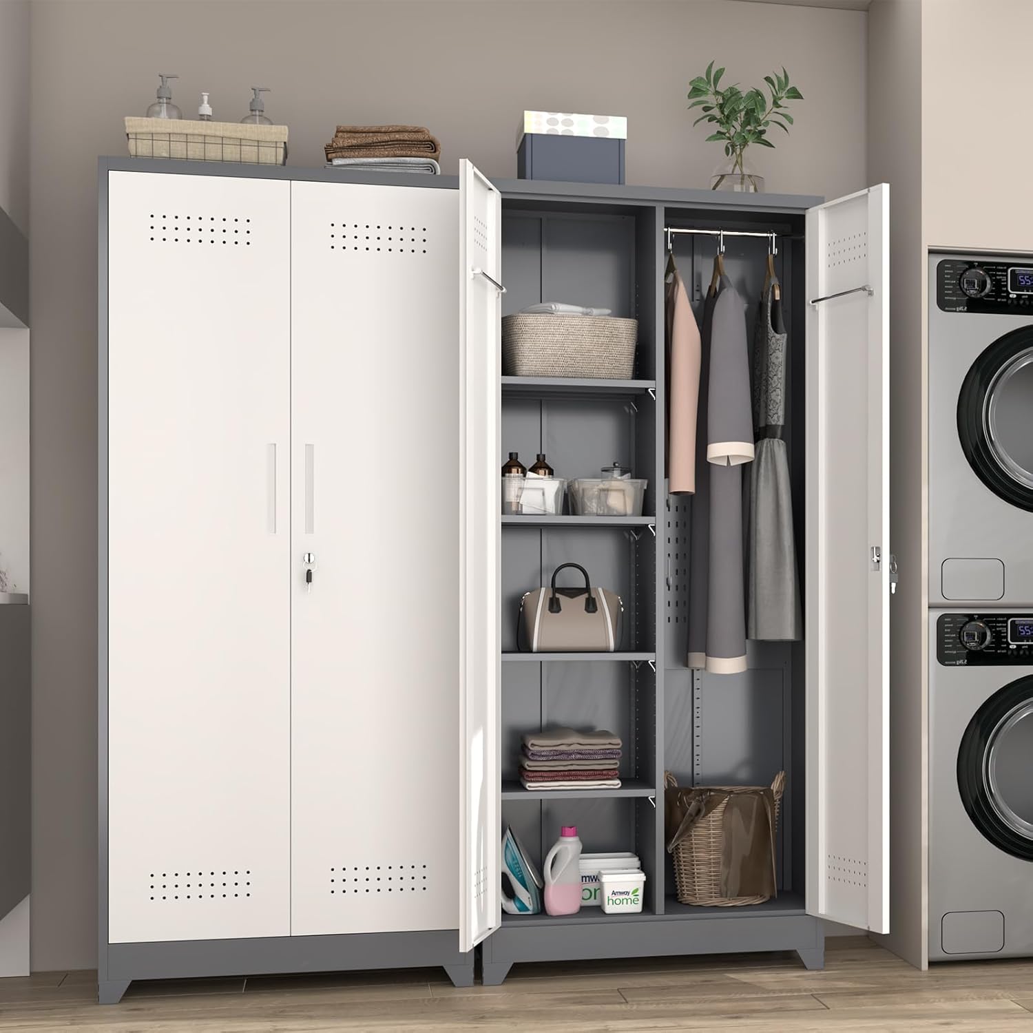 - 【User-Friendly Design】The bottom of the broom metal cabinets with locking doors and adjustable Shelves is made of stainless steel, which is corrosion-resistant and easy to clean. The ventilation holes on the panel prevent moisture and allow breathability, keeping the interior dry and reducing odors. The four standing feet enhance the stability of the cabinet and make it easier to clean underneath.