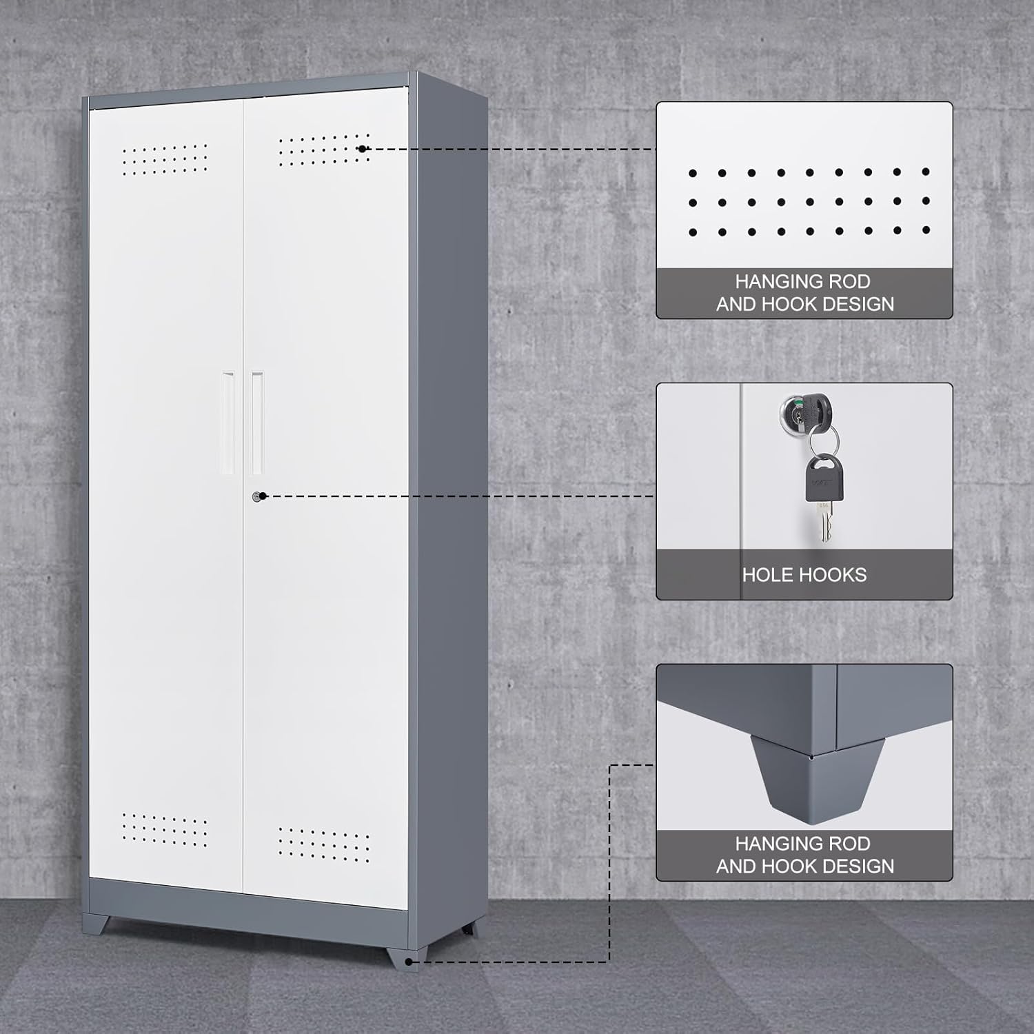 GREATMEET 72.8" Broom Storage Cabinet, Utility Cabinets for Brooms and Mops, Metal Storage Cabinets for Cleaning Supplies, Utility Closet for Garage, Grey&White