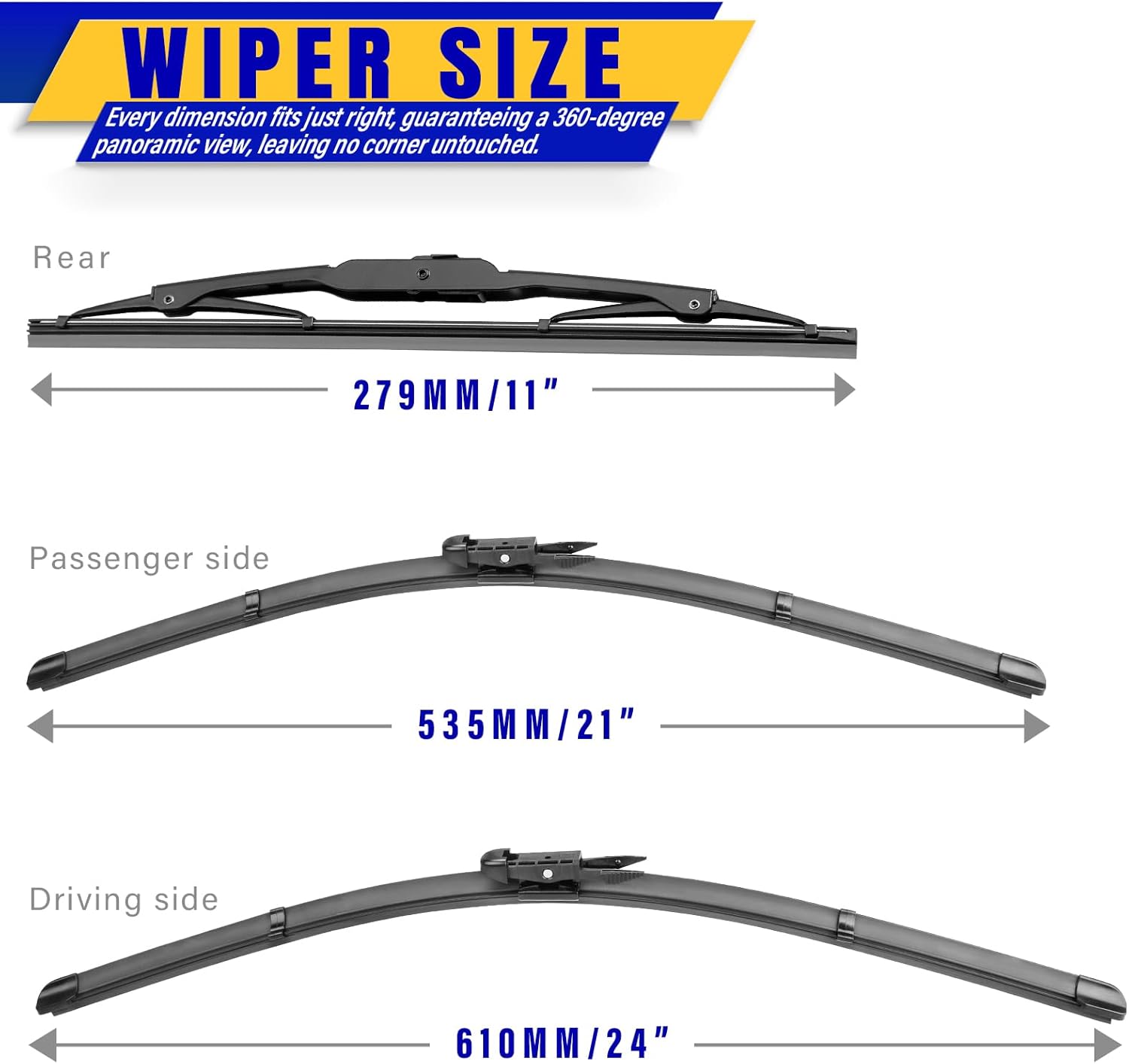 - 【WORRY-FREE SHOPPING】 3Pcs wiper blades 24"+21"+11" and Instruction Manual. One Year warranty! Refund or return anytime in one year, Long life, smooth engagement.