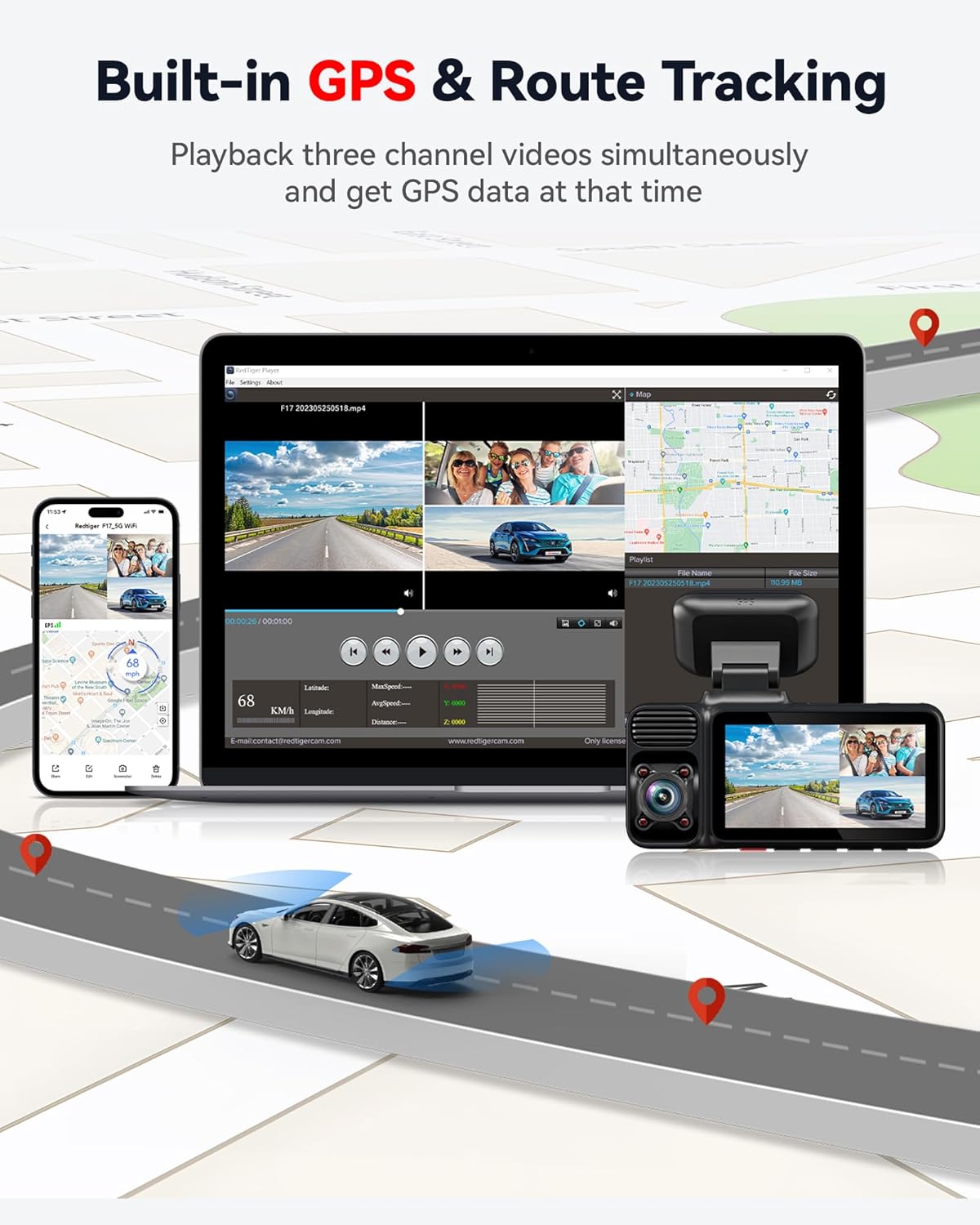 - [Upgraded 5G WiFi&GPS] The F17 dashcam is compatible with the REDTIGER app, which allows you to instantly access films and record routes on your phone. With 5G WiFi, you may enjoy faster wireless data transfer and conveniently share videos while on the go. Simultaneously replay 3 channel videos, effortlessly monitor video metrics and get real-time GPS data as evidence in accidents.
