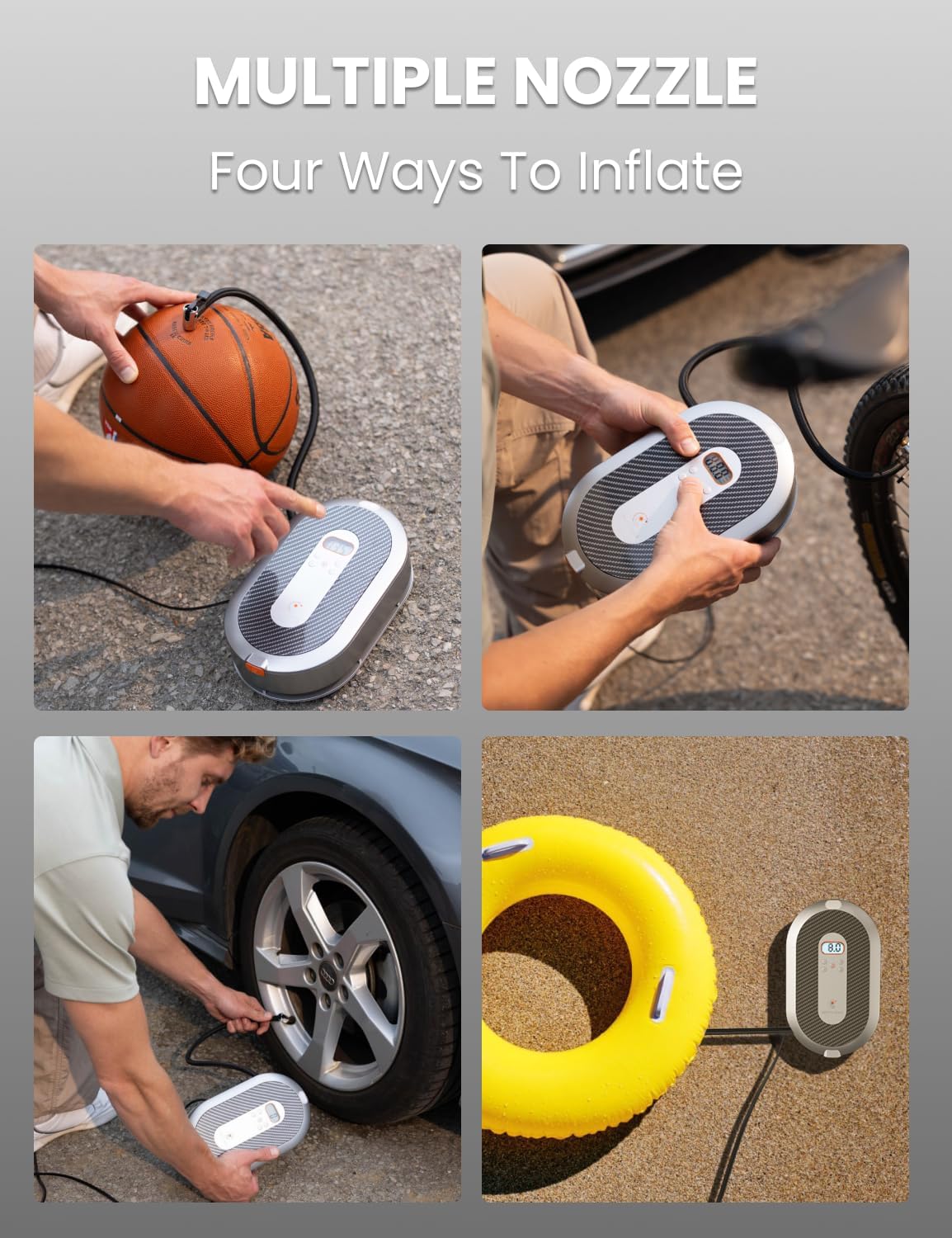 - 4 Inflation Adapters: There are 4 additional inflation adapters and fuses stored in the pump slot on the back of the air compressor to inflate car tires, bicycles, motorcycles, balls, air mattresses, swim rings and more.