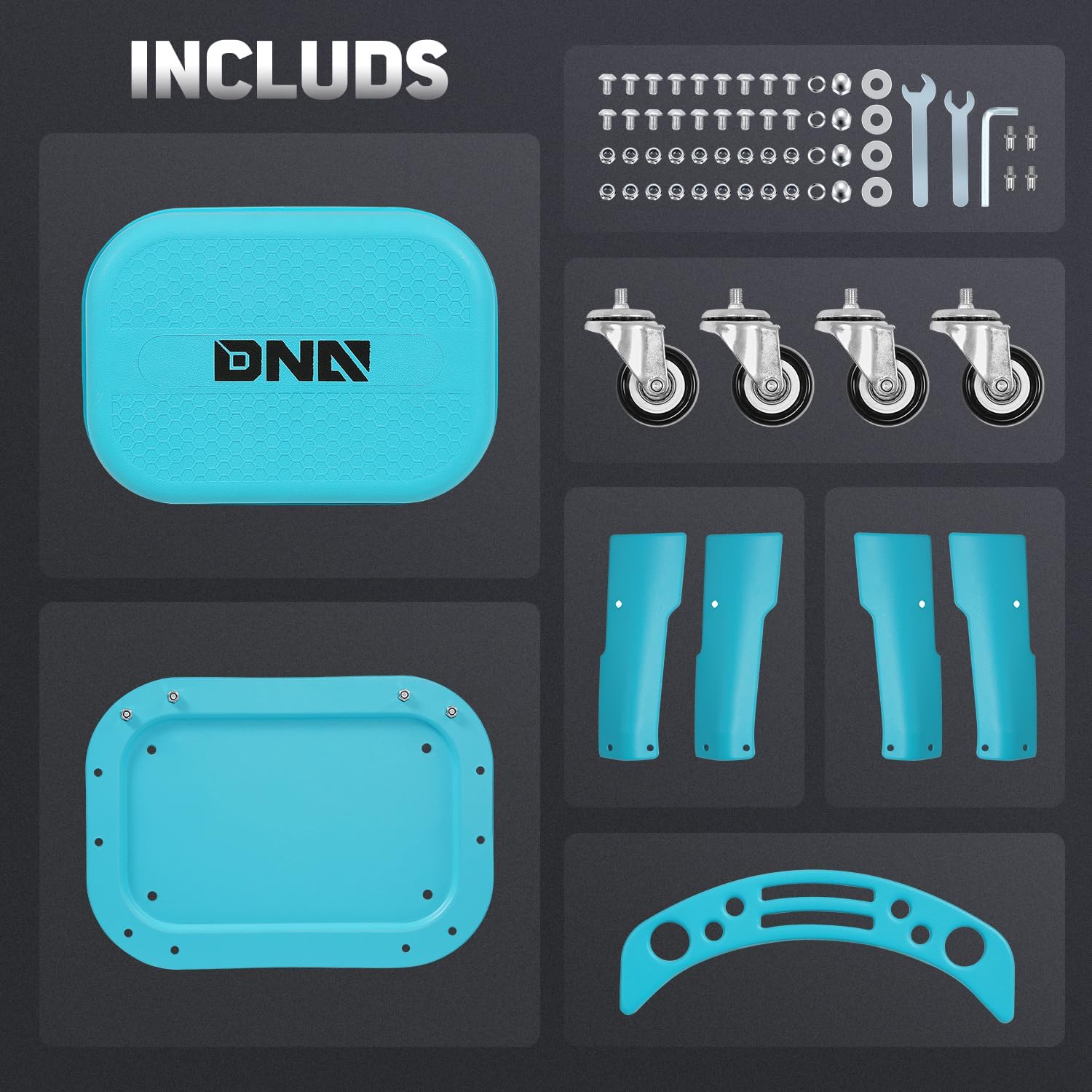 DNA MOTORING Removable Rolling Garage Stool with Seat Cushion & Tool Tray Plate, 300lbs Max Weight Capacity, Blue, TOOLS-00479