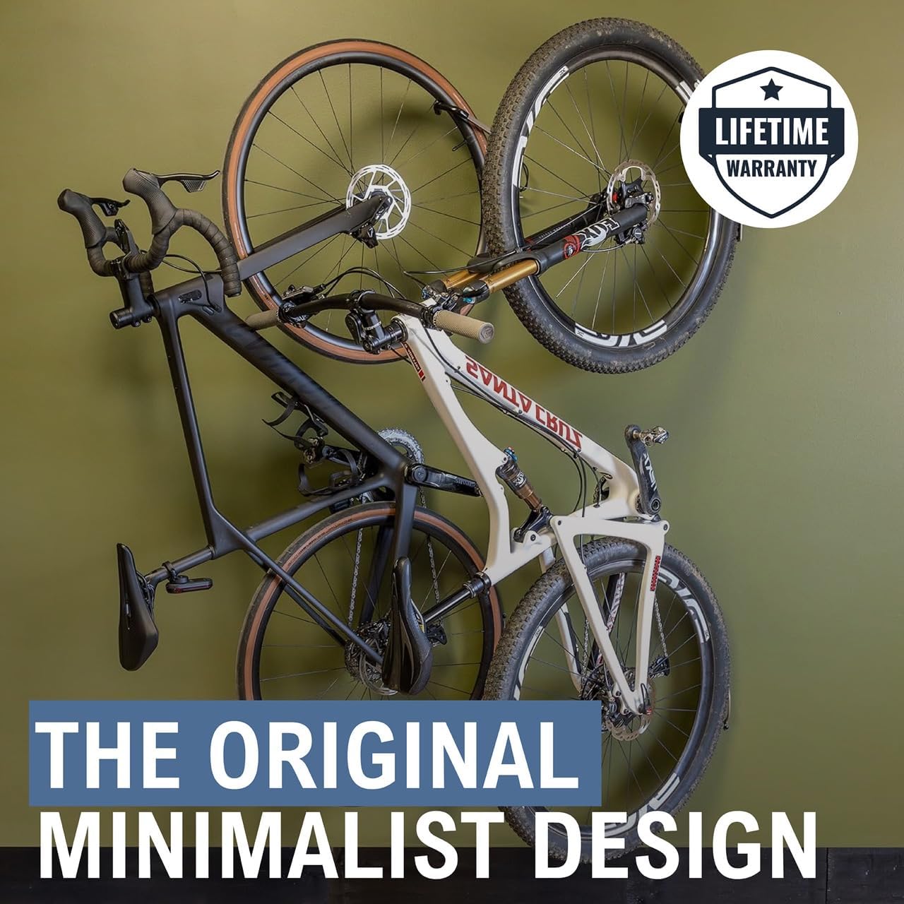 • WALL-MOUNTED BIKE STORAGE – Reclaim your garage, shed, or apartment space with this space-saving vertical bike rack. Designed to mount securely to wall studs, each rack stores one bicycle flat against the wall, making it ideal for indoor bike storage in tight spaces. Compatible with a variety of bikes including road bikes, e-bikes, folding bikes, and more. Fits tires up to 2.6" wide and up to 29" in diameter.