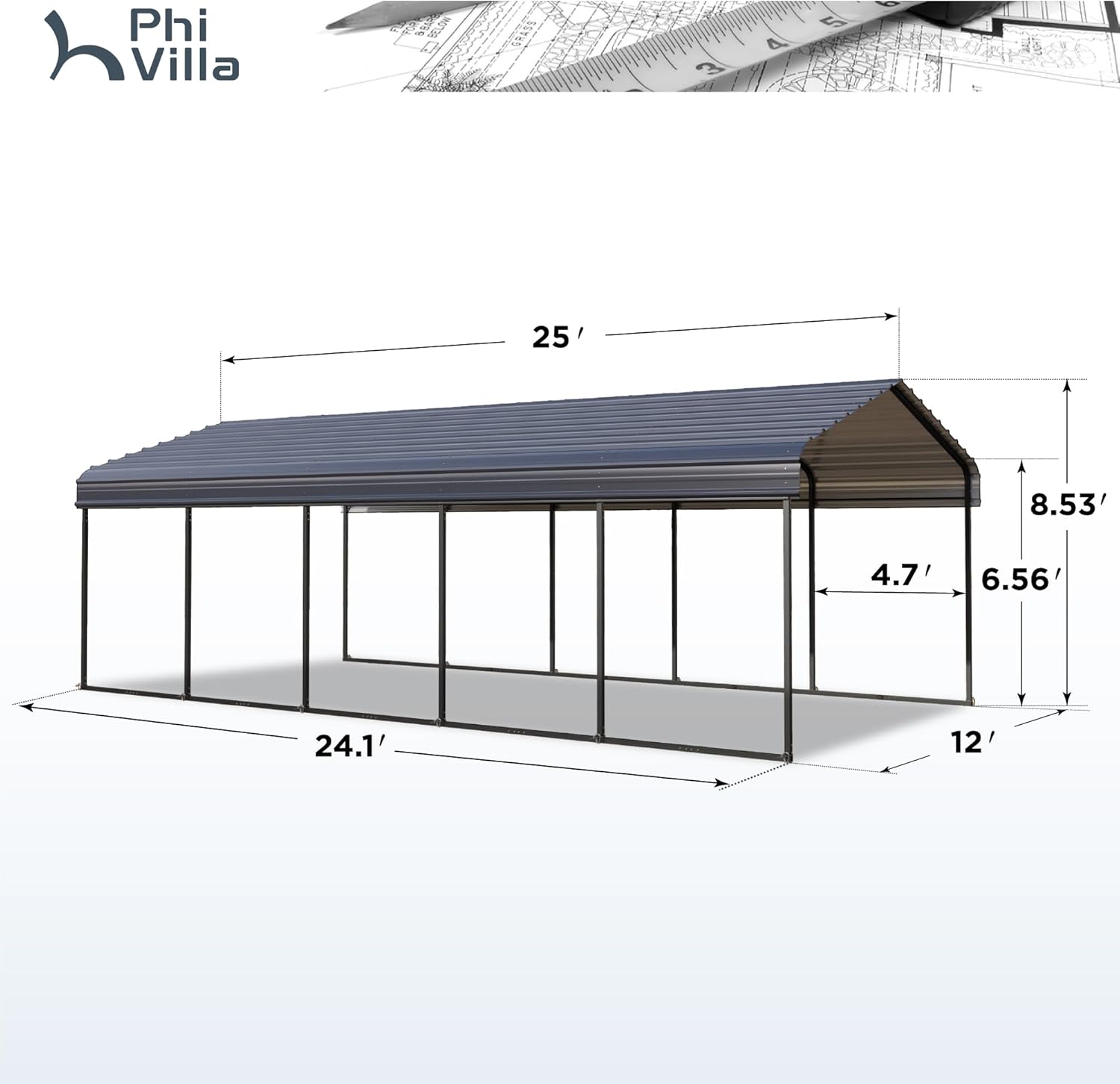 PHI VILLA Outdoor Carport Canopy 12' x 25', Metal Carport Tent Heavy Duty, Garage Car Shelter Shade with Metal Roof, Frame and Bolts for Car, Truck and Boat