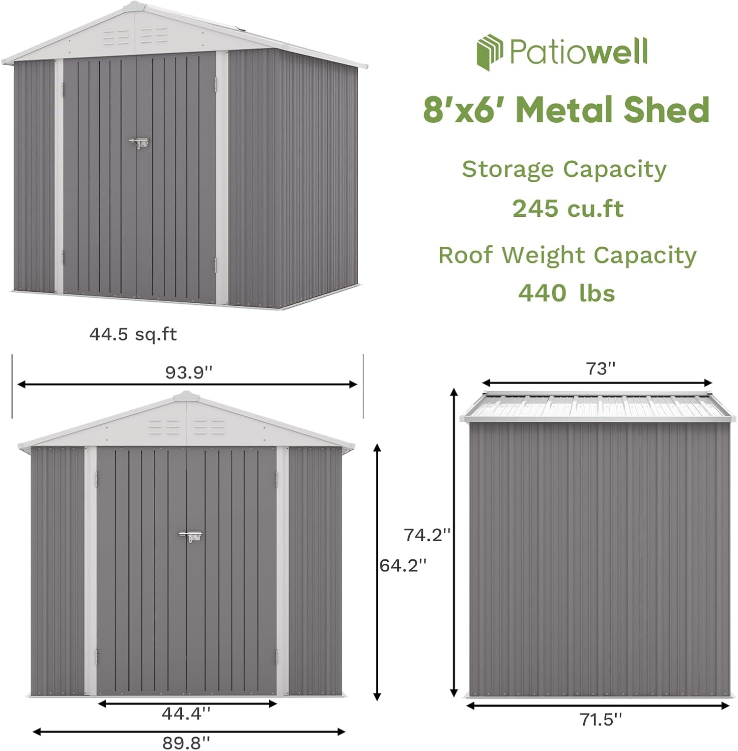 Patiowell 8x6 FT Outdoor Storage Shed, Garden Storage Shed with Sloping Roof and Double Lockable Door, Outdoor Shed for Backyard Garden Patio Lawn, Gray